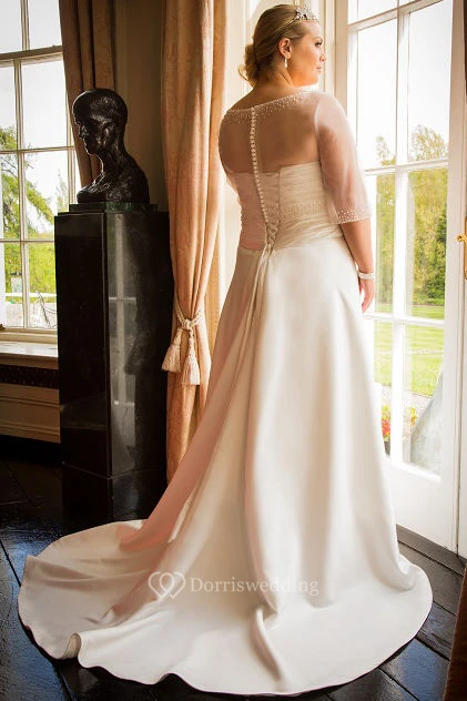 Jewel Neck A-Line Taffeta Bridal Gown With Tulle Half-Sleeve Top