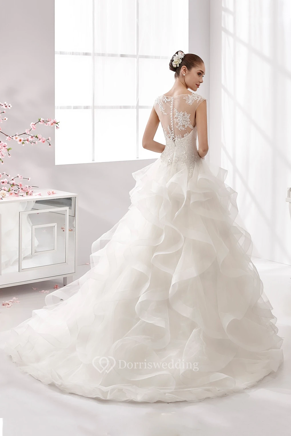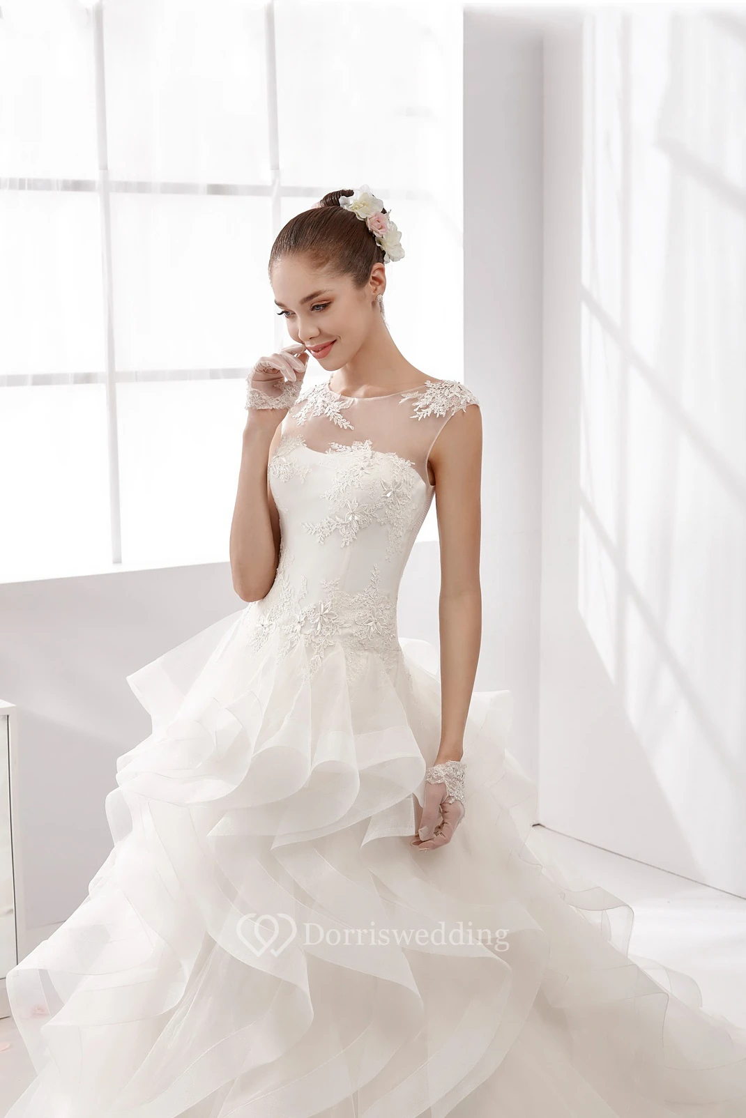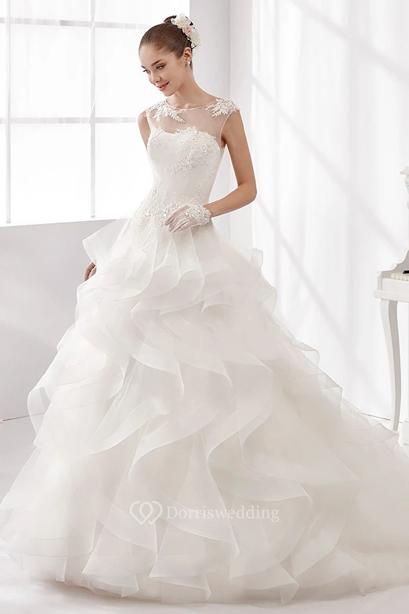 Jewel-Neck A-Line Wedding Gown with Cascading Ruffles and Illusive Neckline