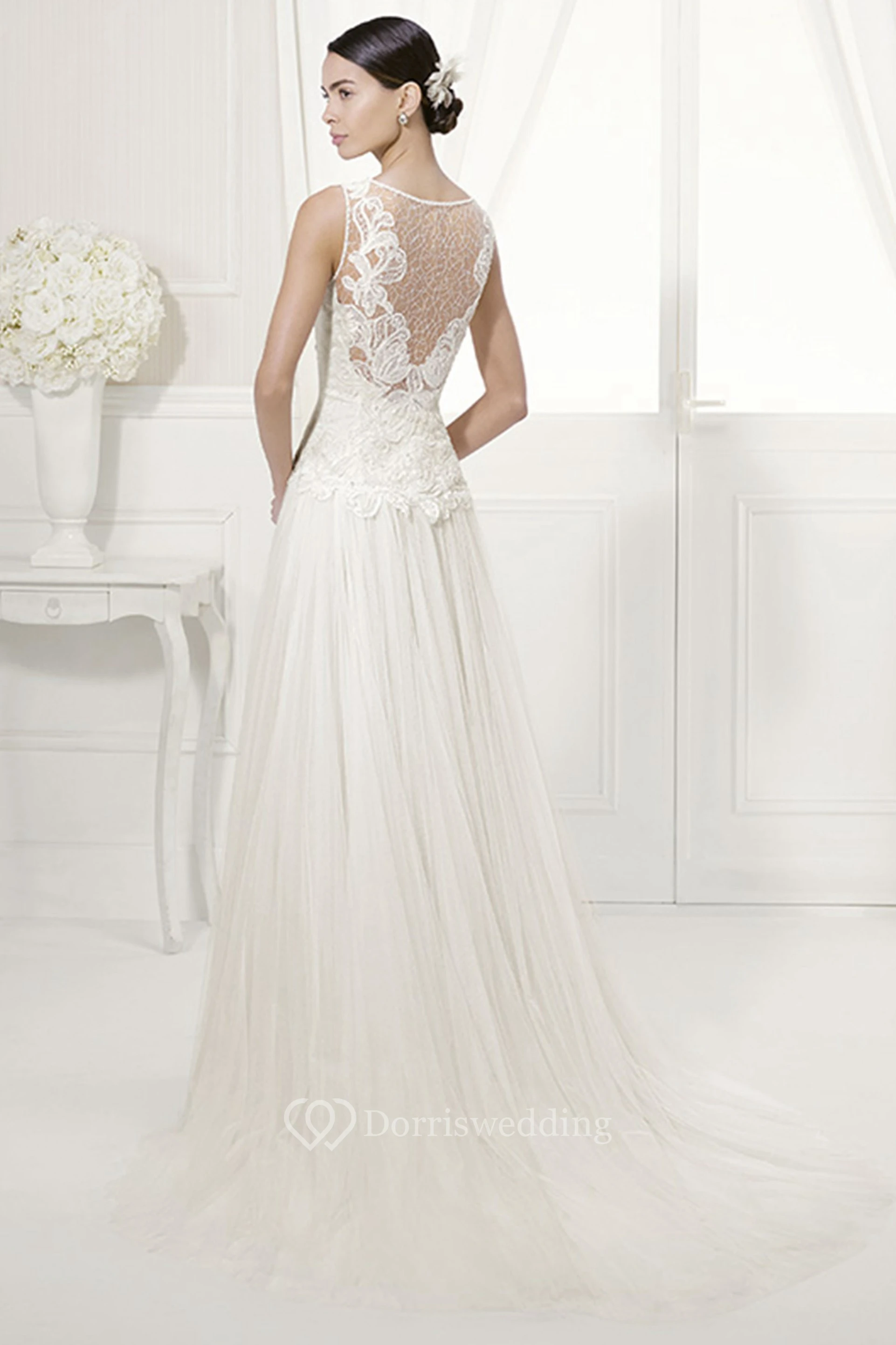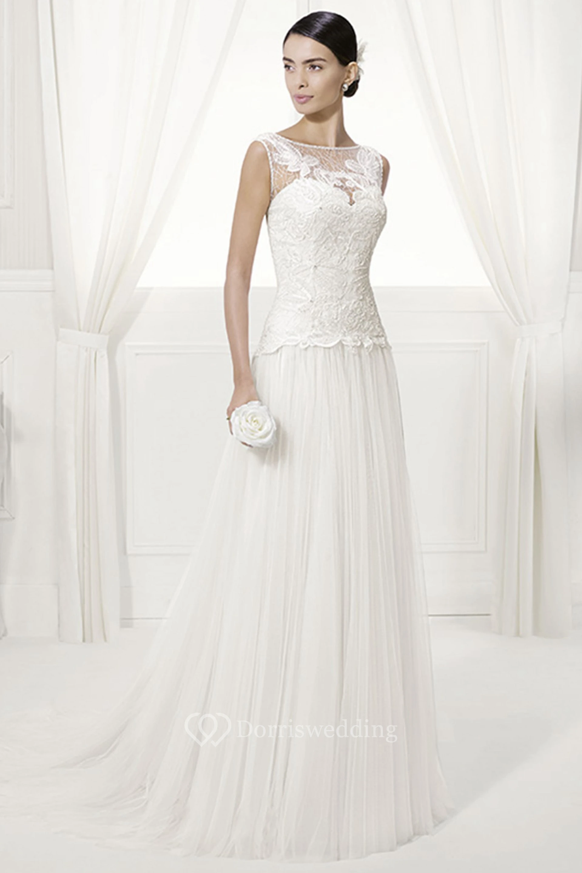 Jewel Neck Appliqued Bodice Bridal Gown With Pleated Tulle Skirt