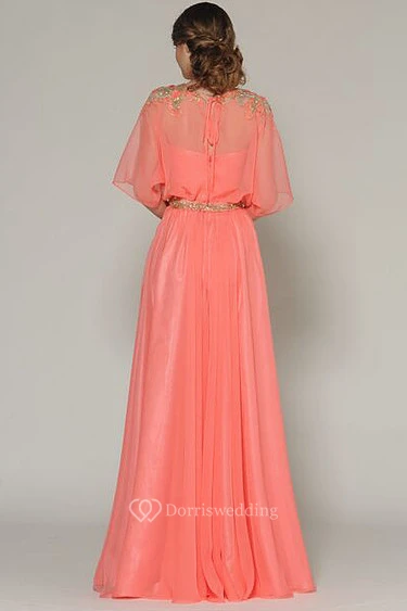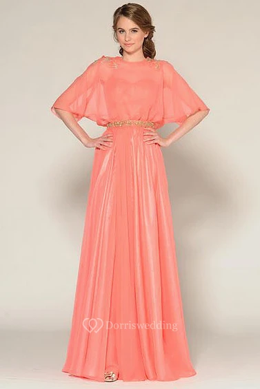 Jewel-Neck Bat-Sleeve Long Jeweled Prom Dress With Pleats