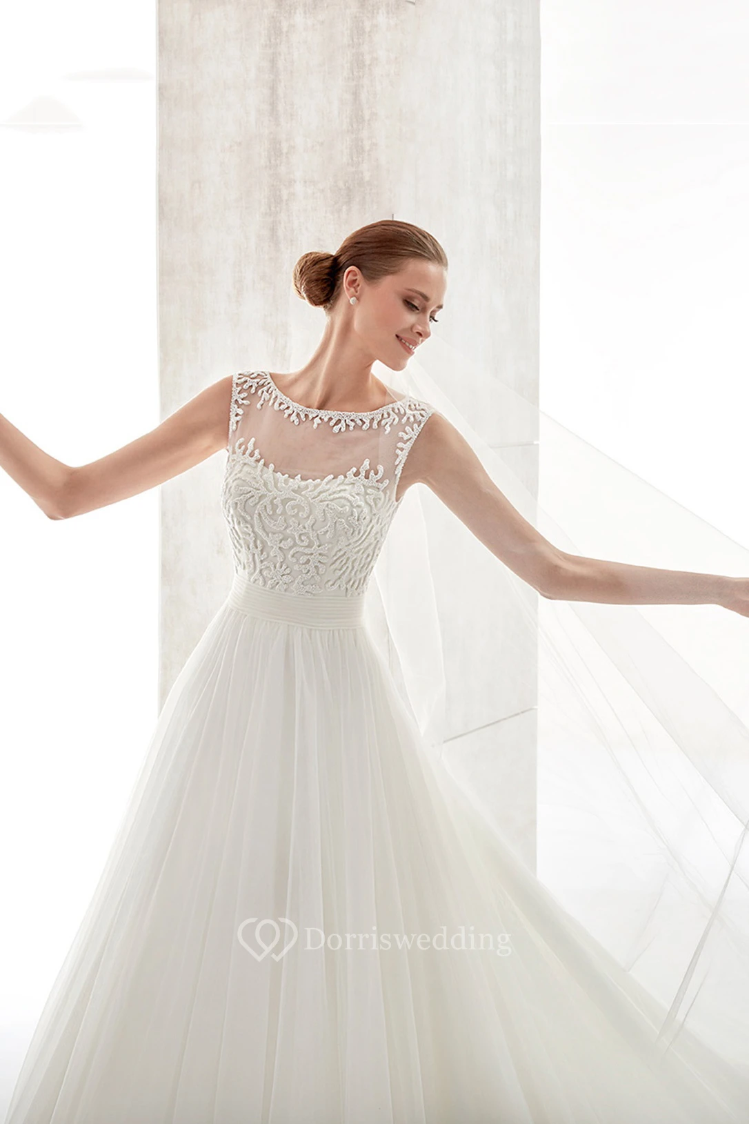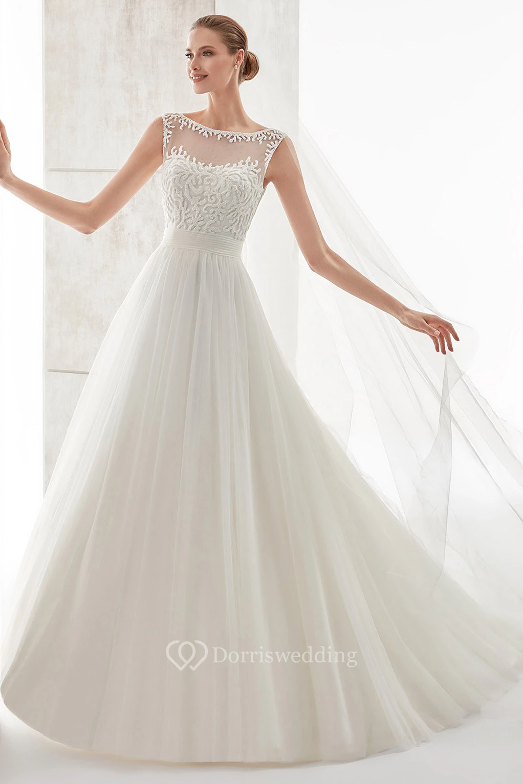 Jewel-Neck Cap-Sleeve A-Line Gown With Lace Bodice And Illusive Neckline And Back