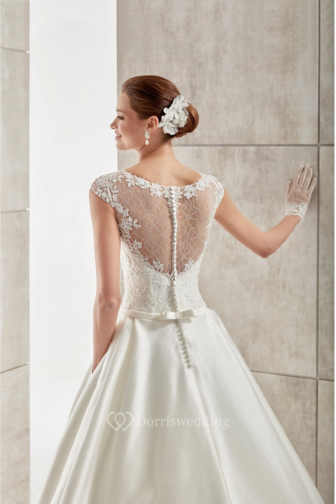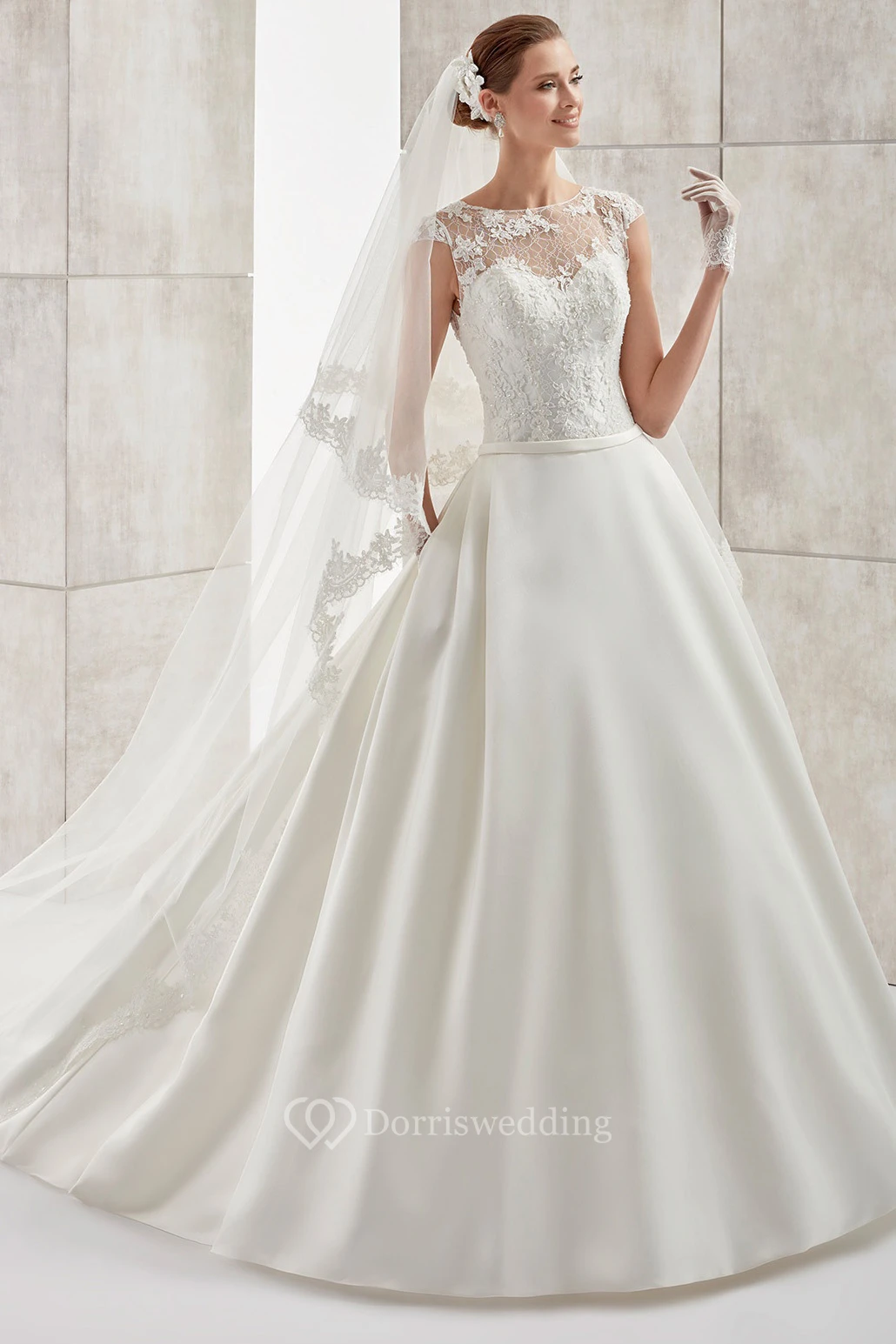 Jewel-Neck Cap-Sleeve A-Line Satin Wedding Dress With Lace Bodice And Illusive Design