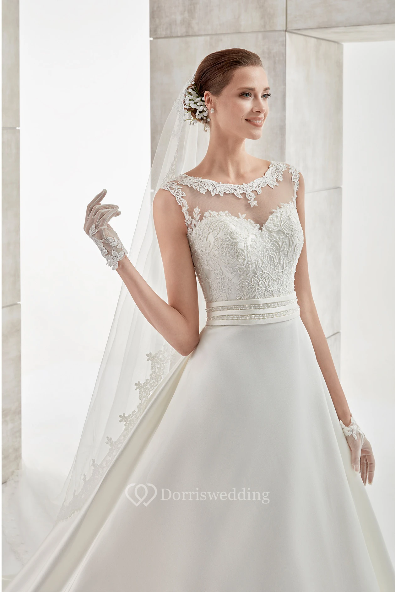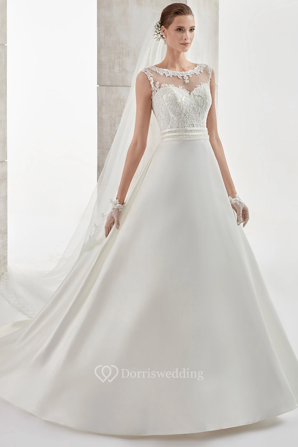 Jewel-Neck Cap-Sleeve A-Line Wedding Dress With Lace Bodice And Brush Train