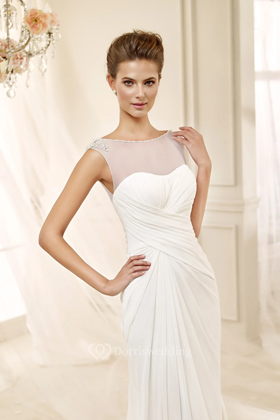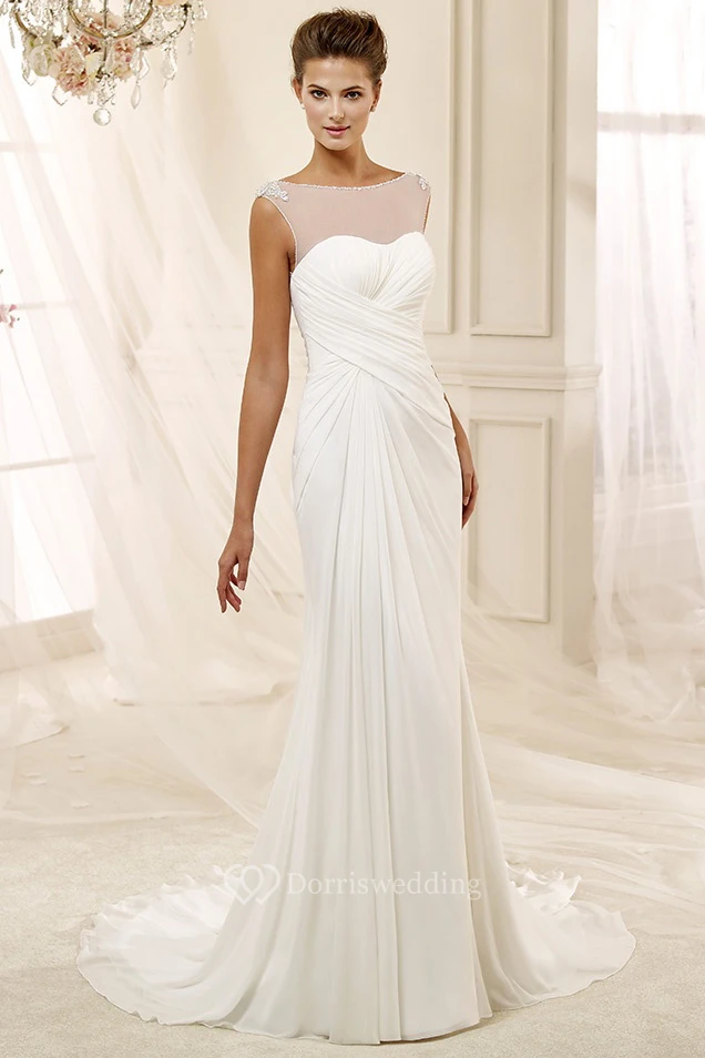 Jewel-Neck Cap-Sleeve Draping Chiffon Wedding Dress With Bandage Waist And Illusive Neckline
