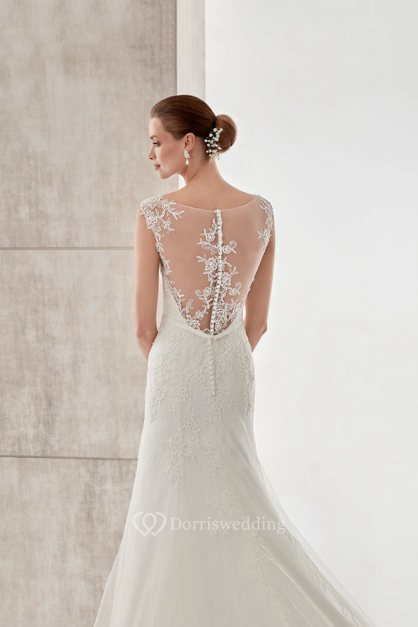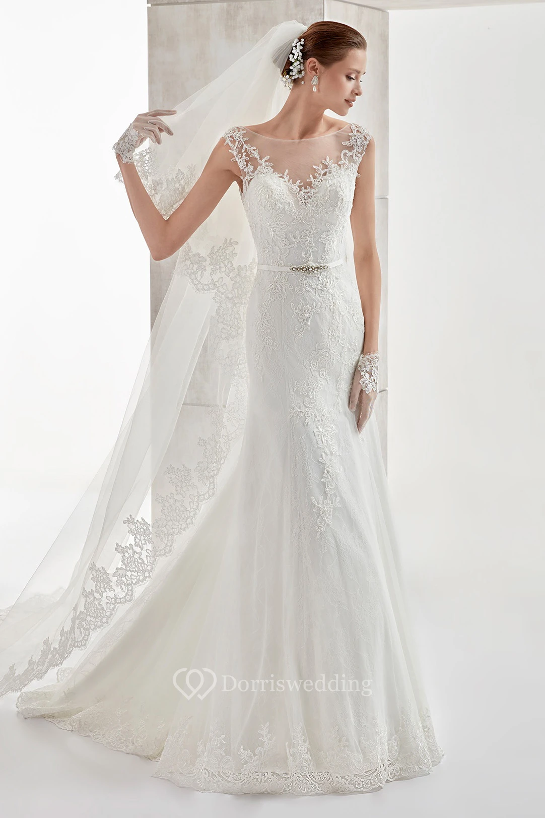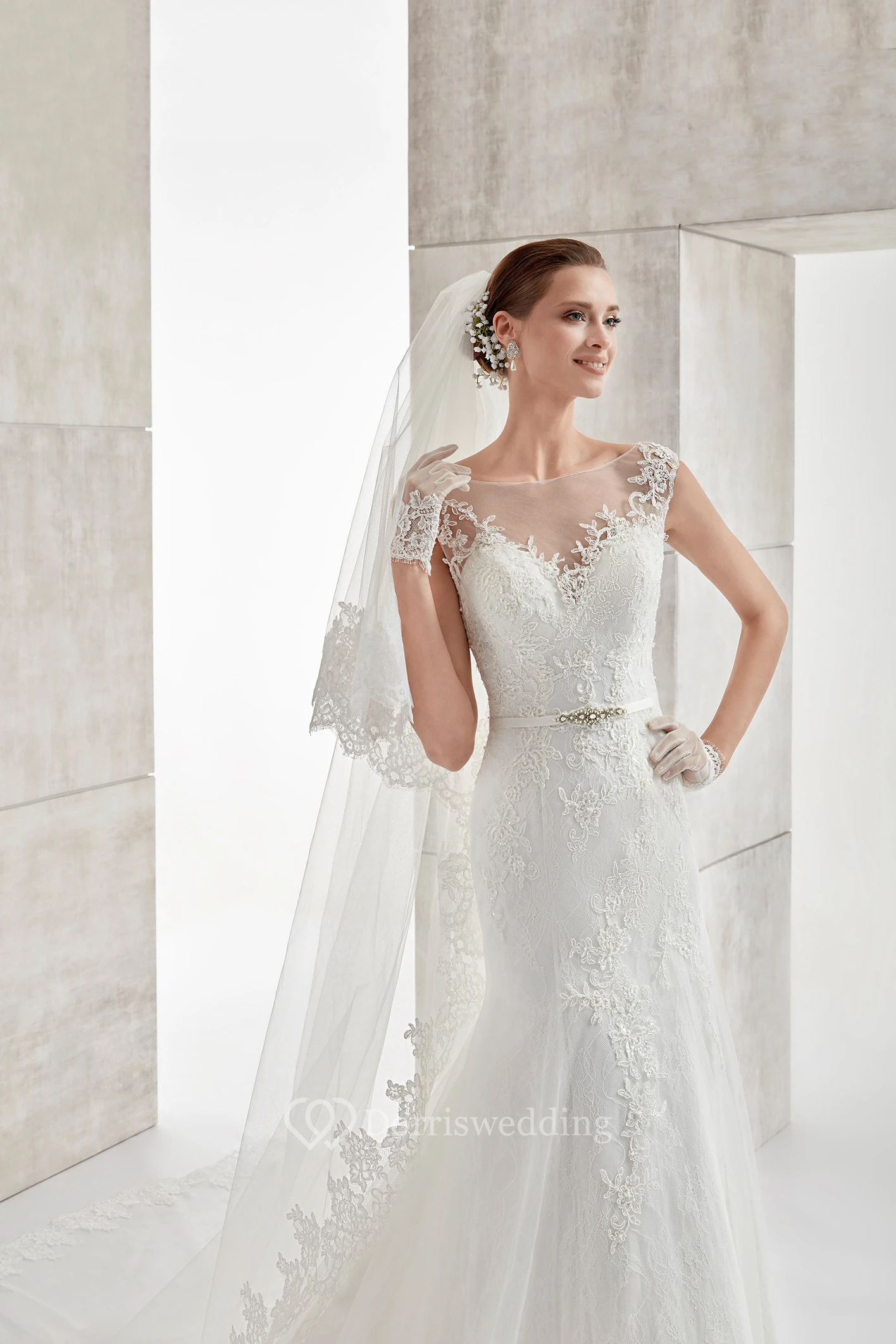 Jewel-neck Cap-sleeve Mermaid Wedding Dress with Beaded Belt and Illusive Design