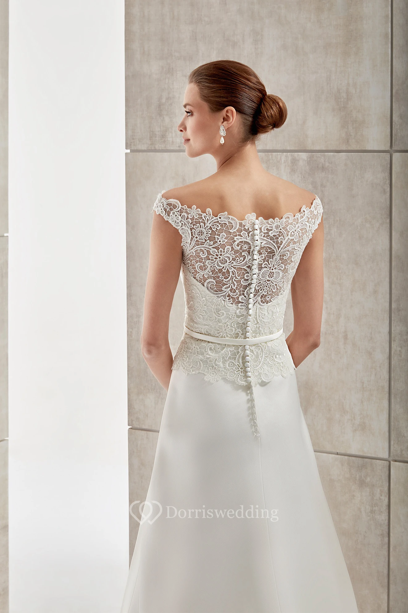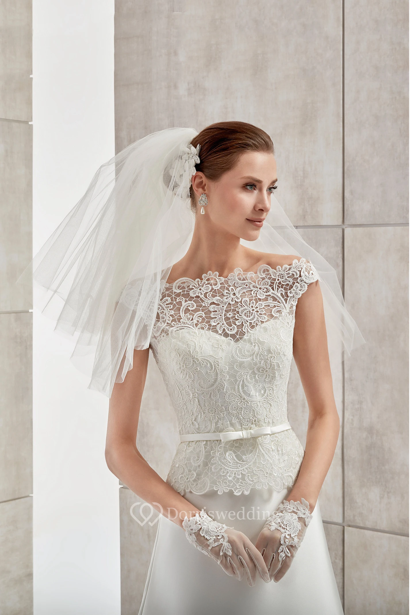 Jewel-Neck Cap-Sleeve Satin Wedding Dress With Lace Bodice