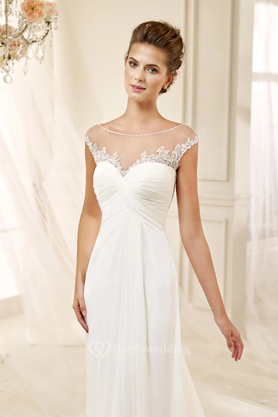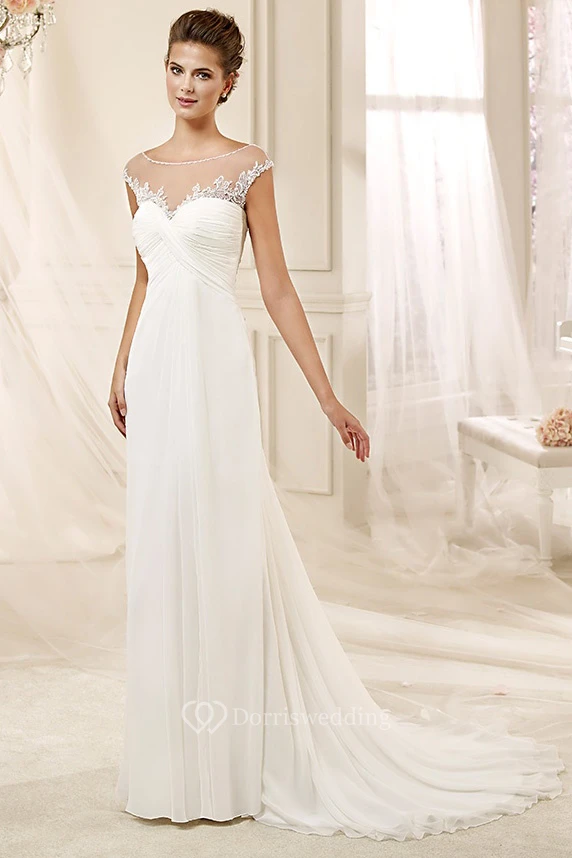 Jewel-Neck Draping Chiffon Wedding Dress With Illusive Neckline And Pleated Bust