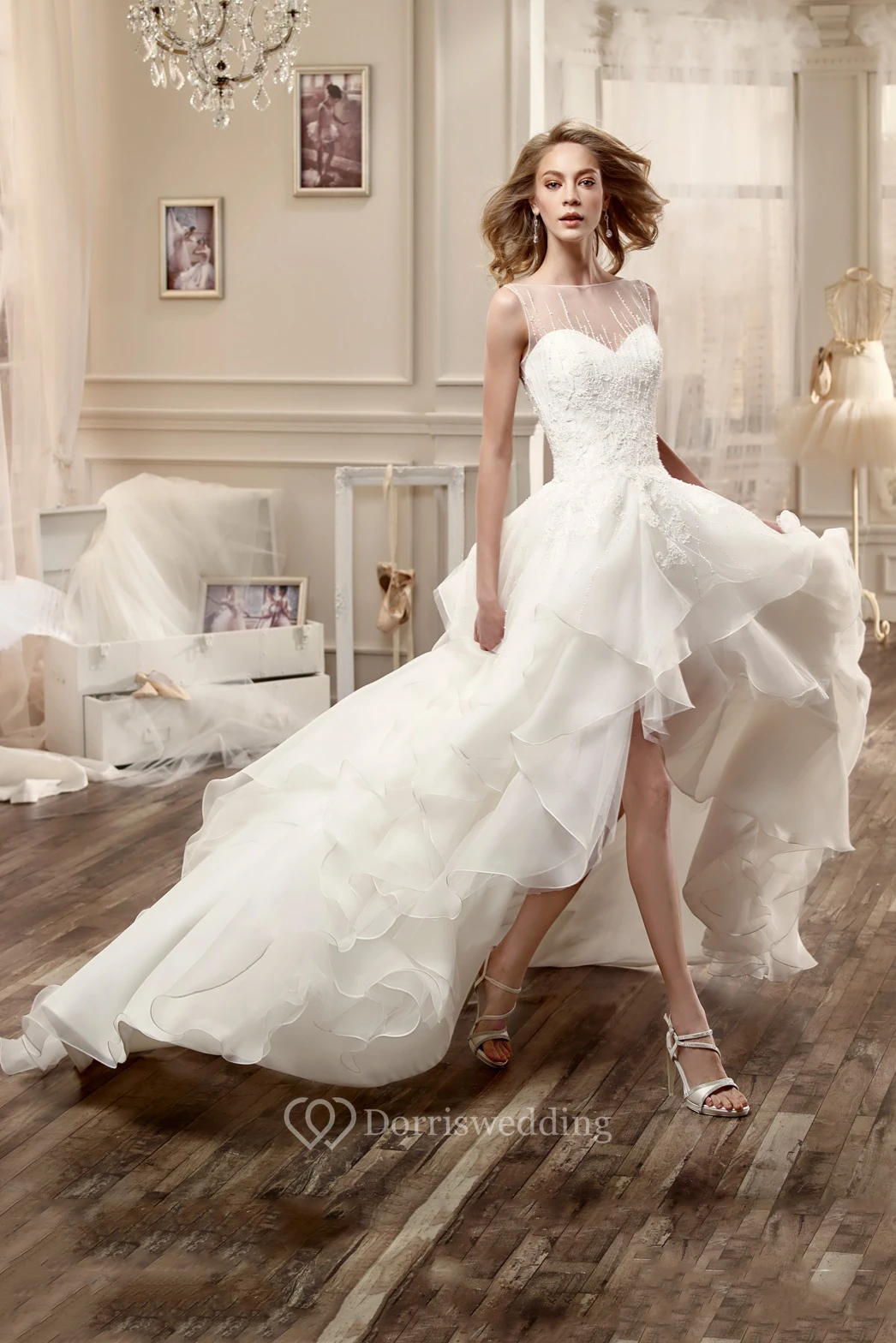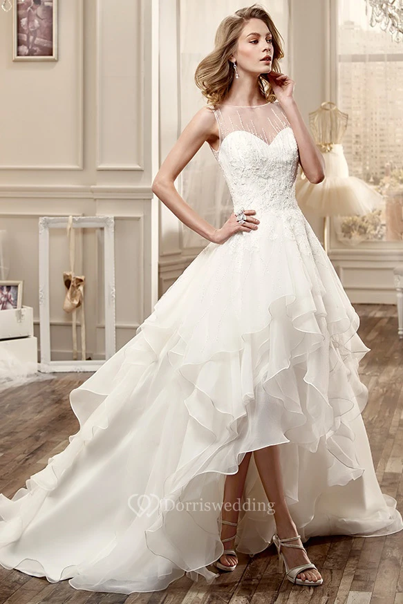Jewel-Neck High-Low Wedding Dress With Cascading Ruffles And Beaded Bodice