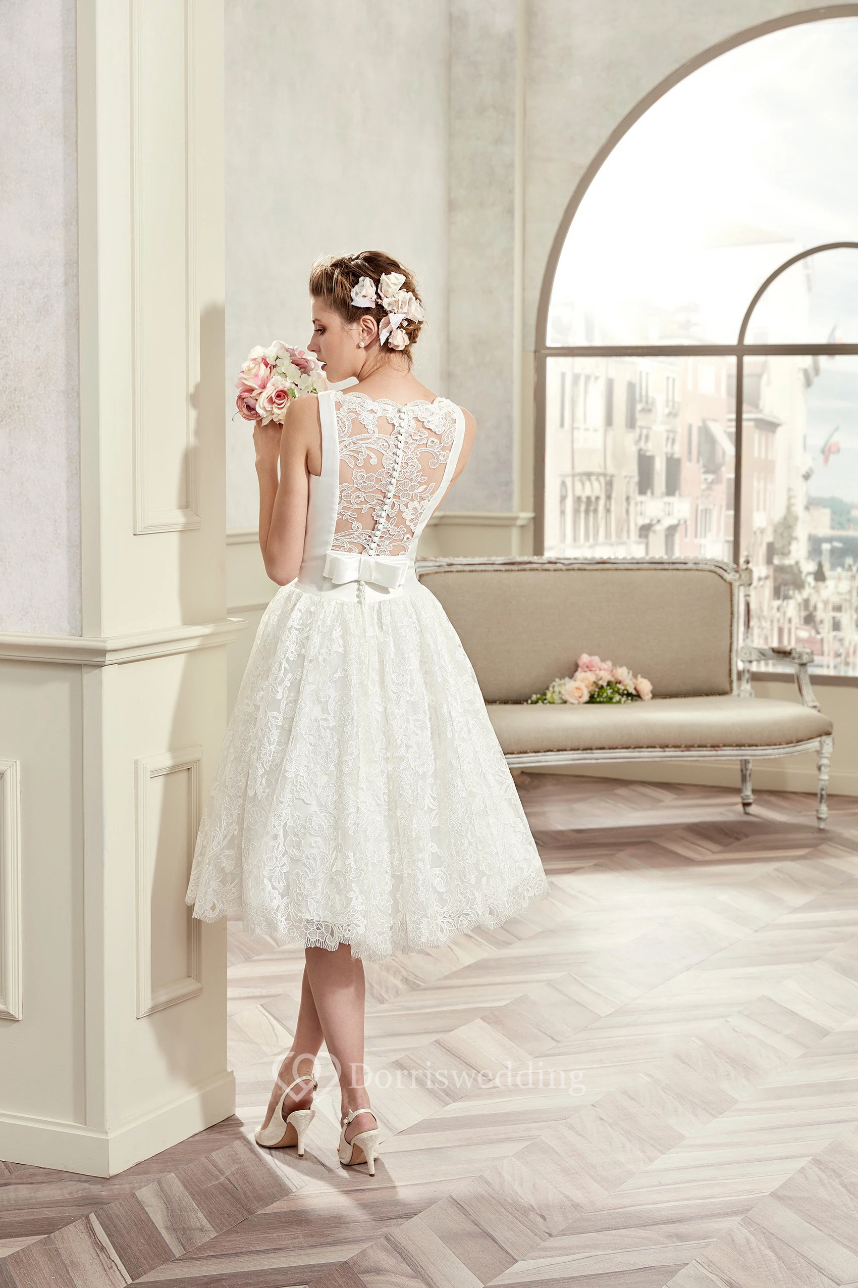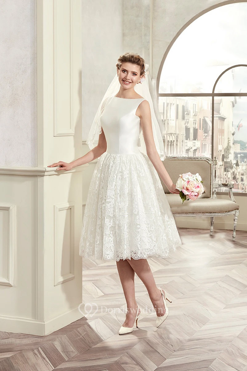 Jewel-Neck Knee-Length Bridal Gown With Satin Bodice And Illusive Lace Back