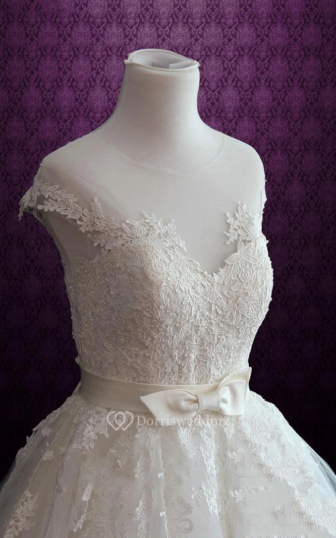 Jewel Neck Lace Bodice Short Dress With Sash And Appliques