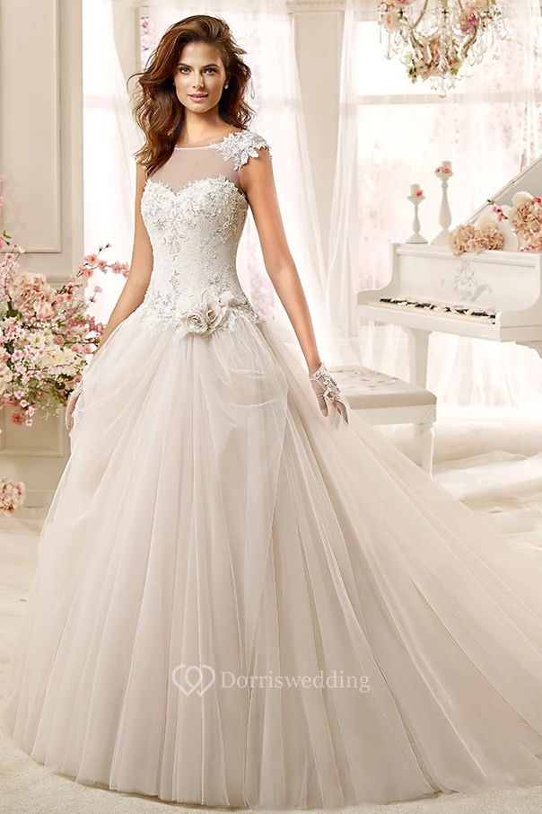 Jewel-neck Low-back A-line Wedding Dress with Flowers and Beaded Bodice