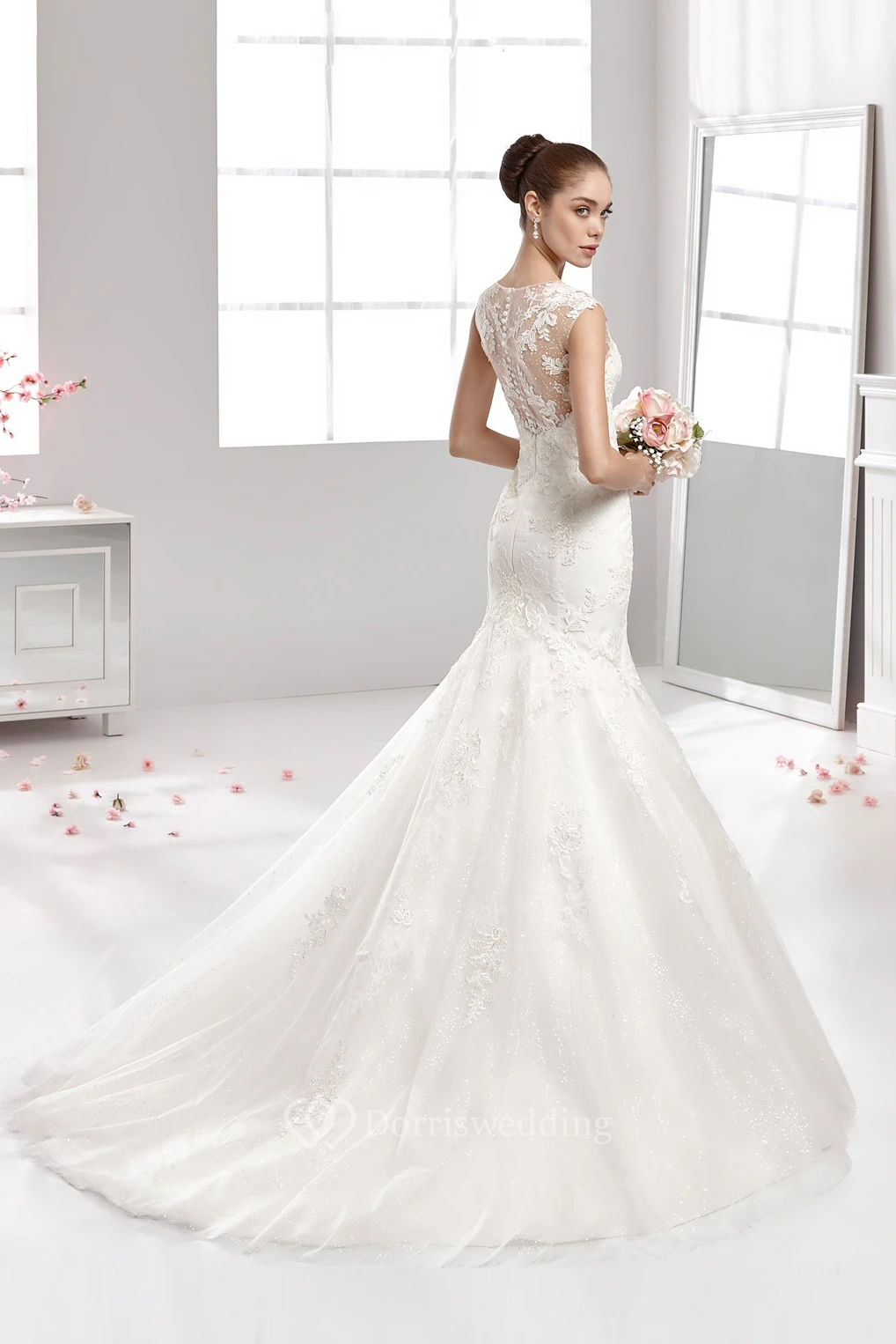 Jewel-Neck Mermaid Lace-Applique Gown With Illusive Neckline And Pleated Train