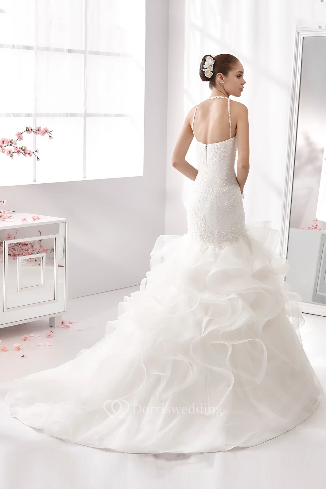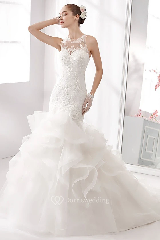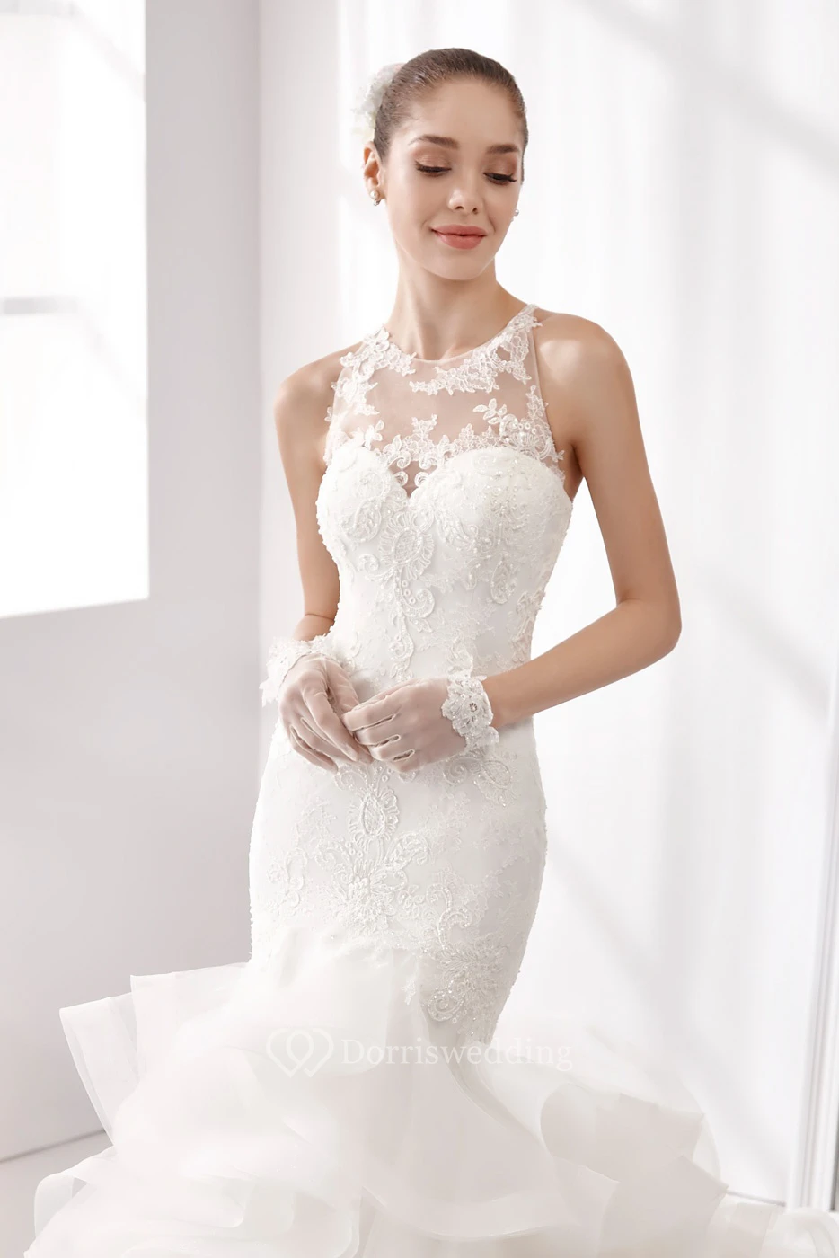 Jewel-Neck Mermaid Lace Gown With Illusive Neckline And Ruching Train