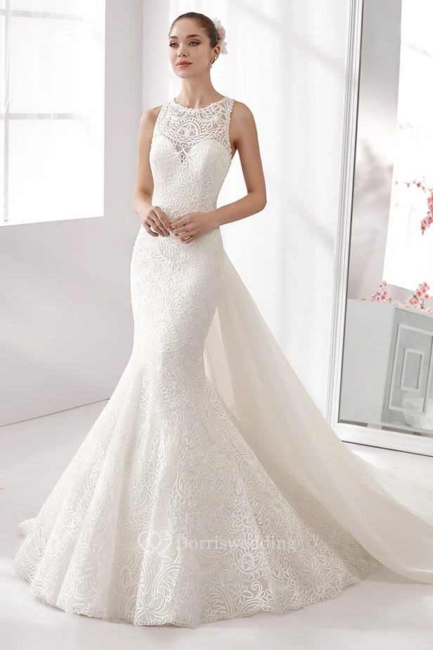 Jewel-Neck Mermaid Lace Wedding Dress With Sheath Style And Detachable Back Bow Train