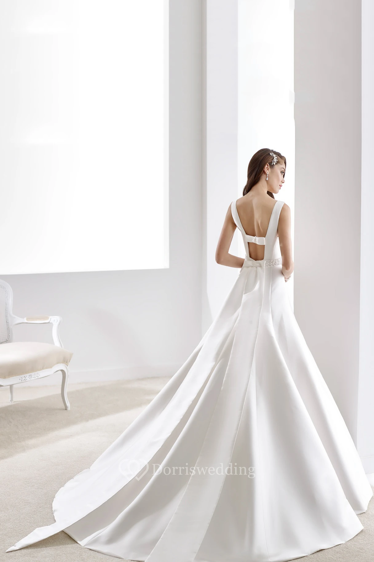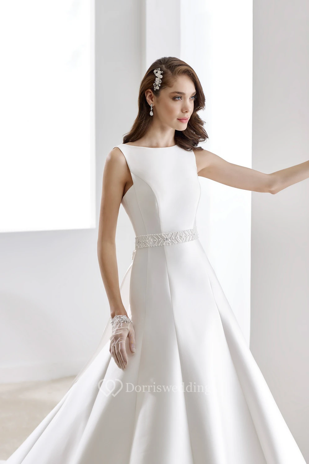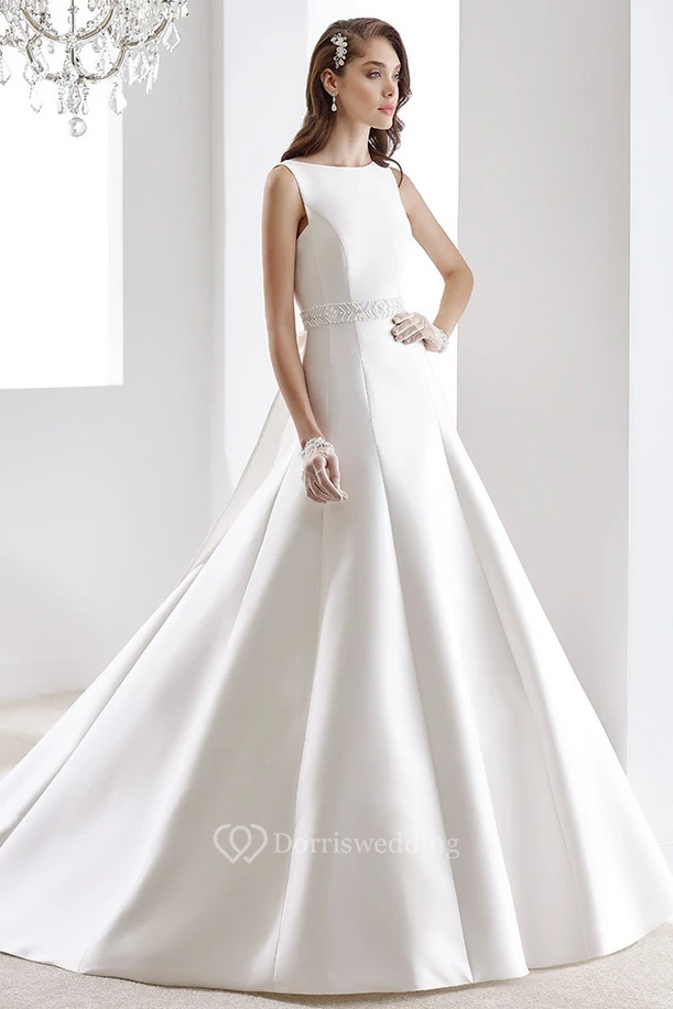 Jewel-neck Satin Wedding Gown with Beaded Belt and One-Strap Back