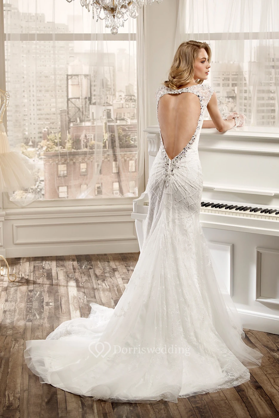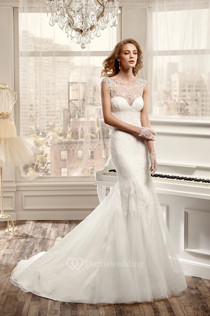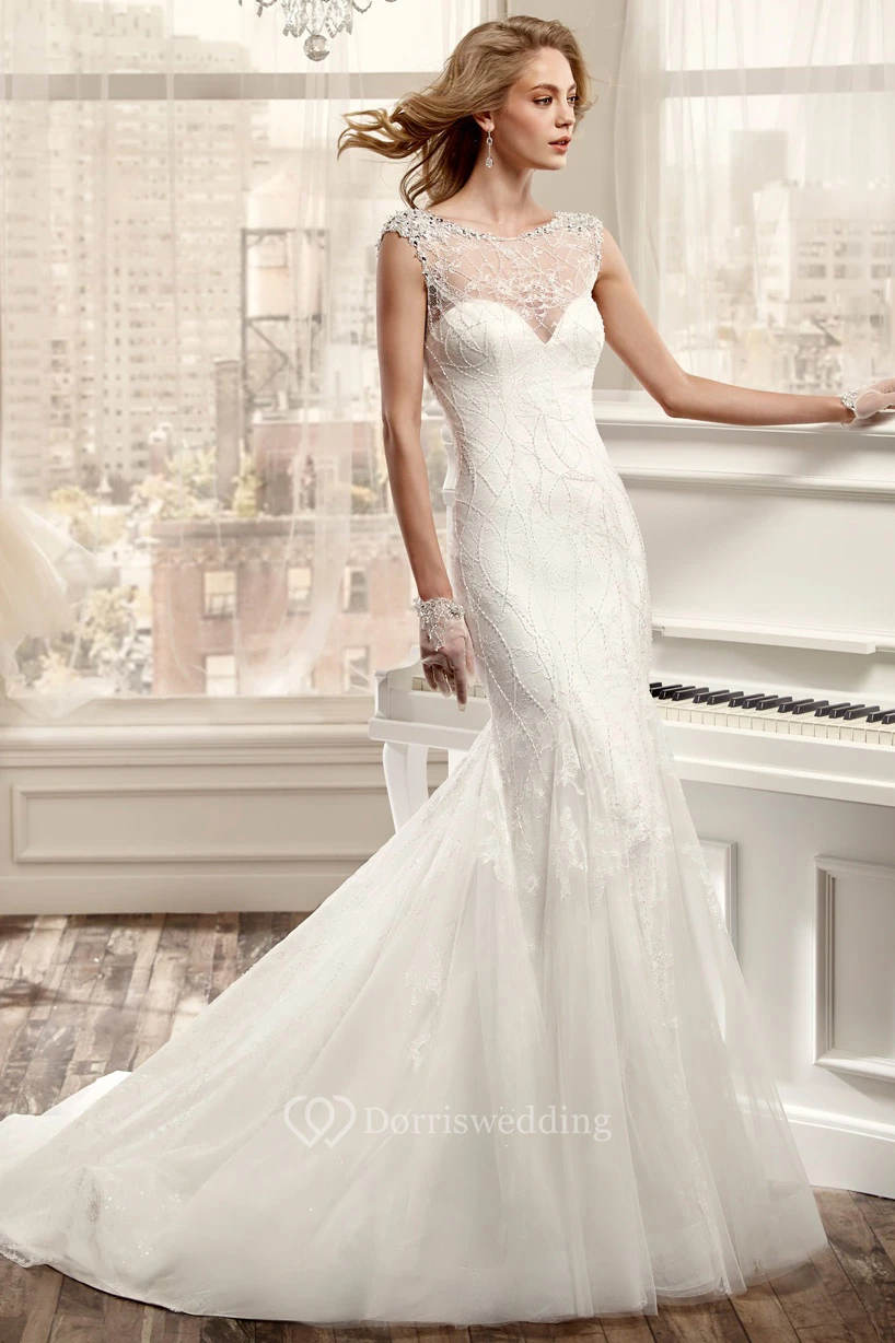 Jewel-Neck Sheath Wedding Dress With Beaded Bodice And Open Back