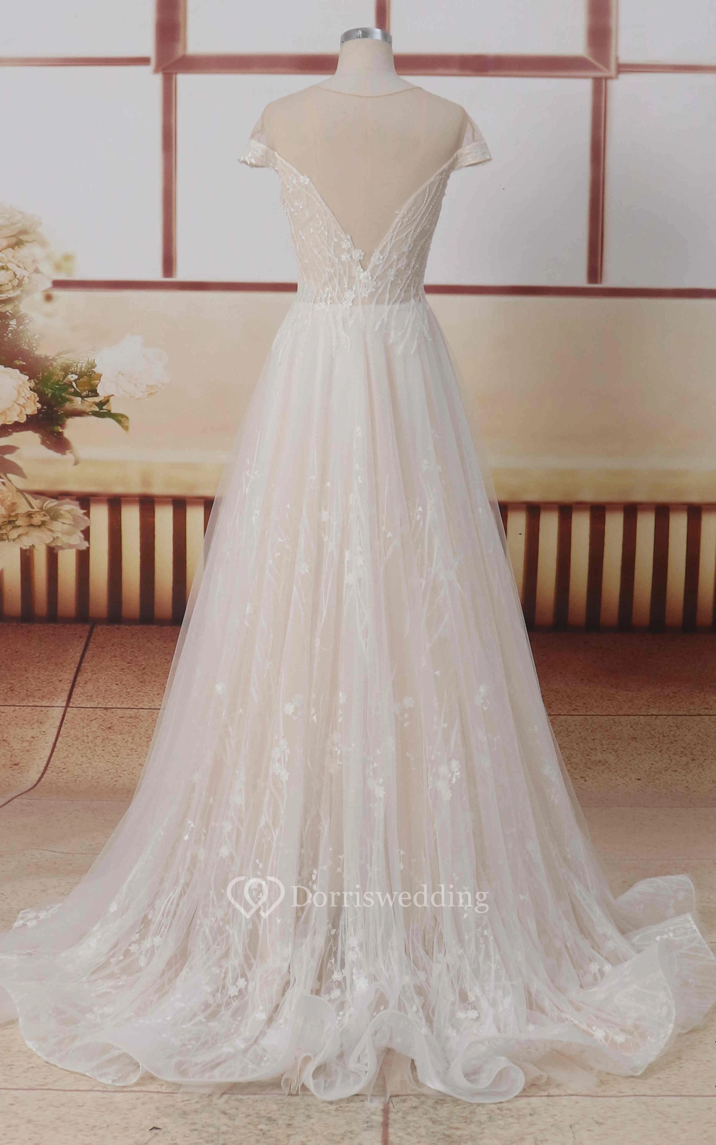 Jewel Neck Short Illusion Sleeves A-line Lace Tulle Wedding Dress With Illusion Back And Pleats