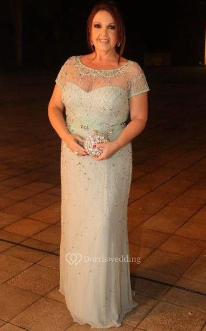 Jewel Neck Short Sleeve Sheath Chiffon Long Dress With Beadings