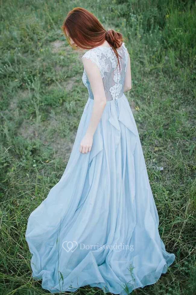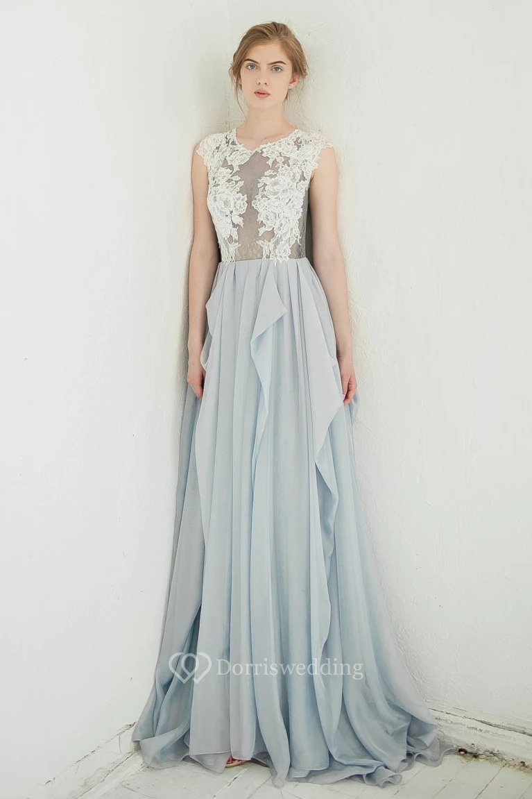 Jewel-Neck Sleeveless A-Line Chiffon Draped Dress With Lace Appliqued Top