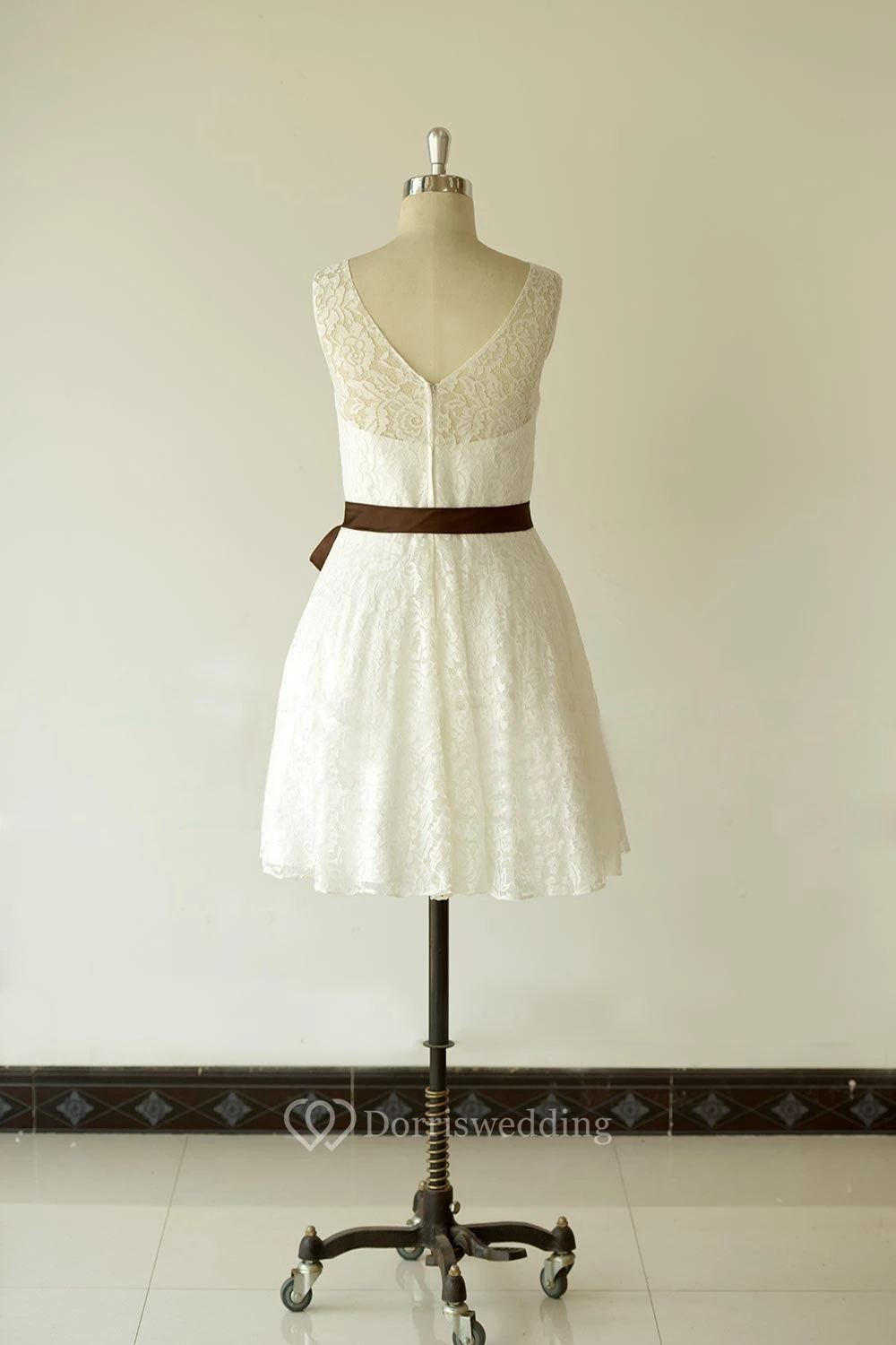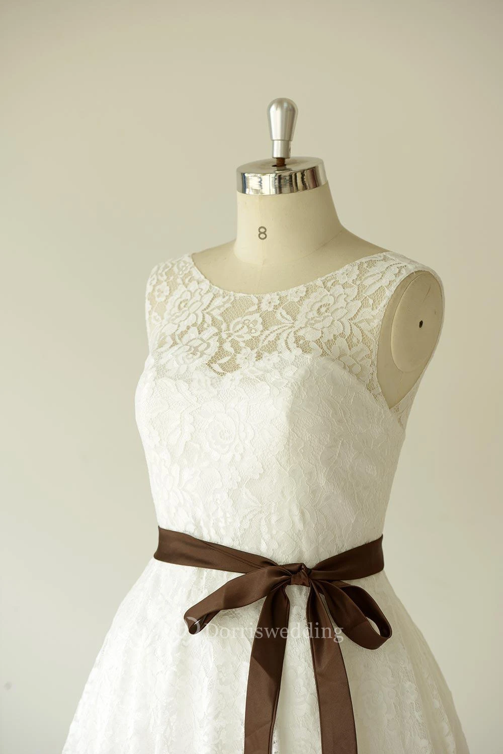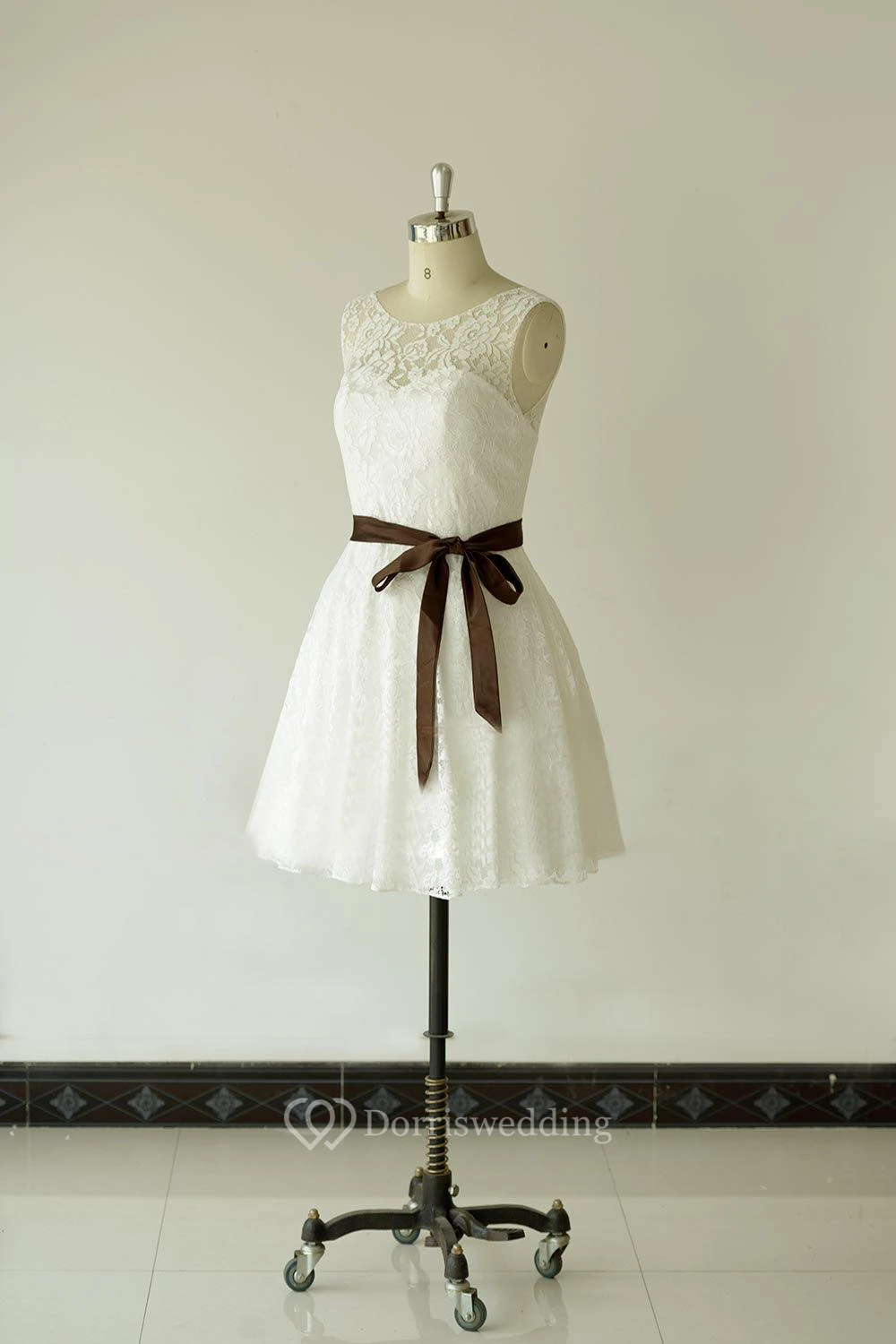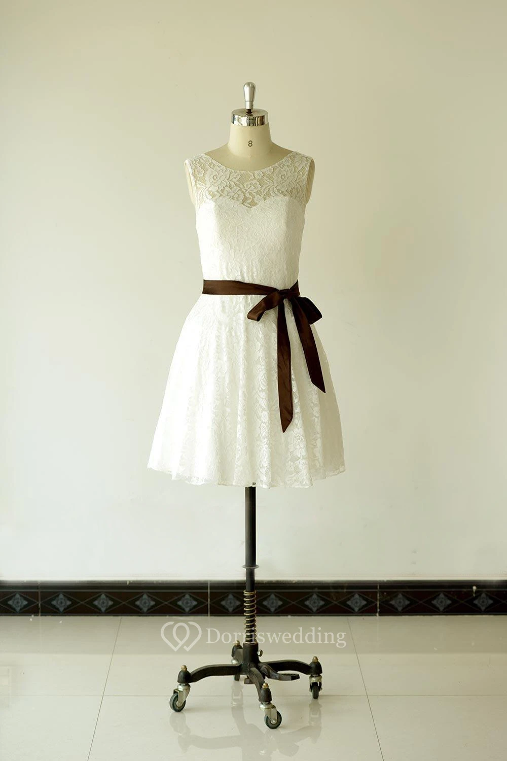 Jewel Neck Sleeveless A-Line Lace Short Dress With Chocolate Bow Sash