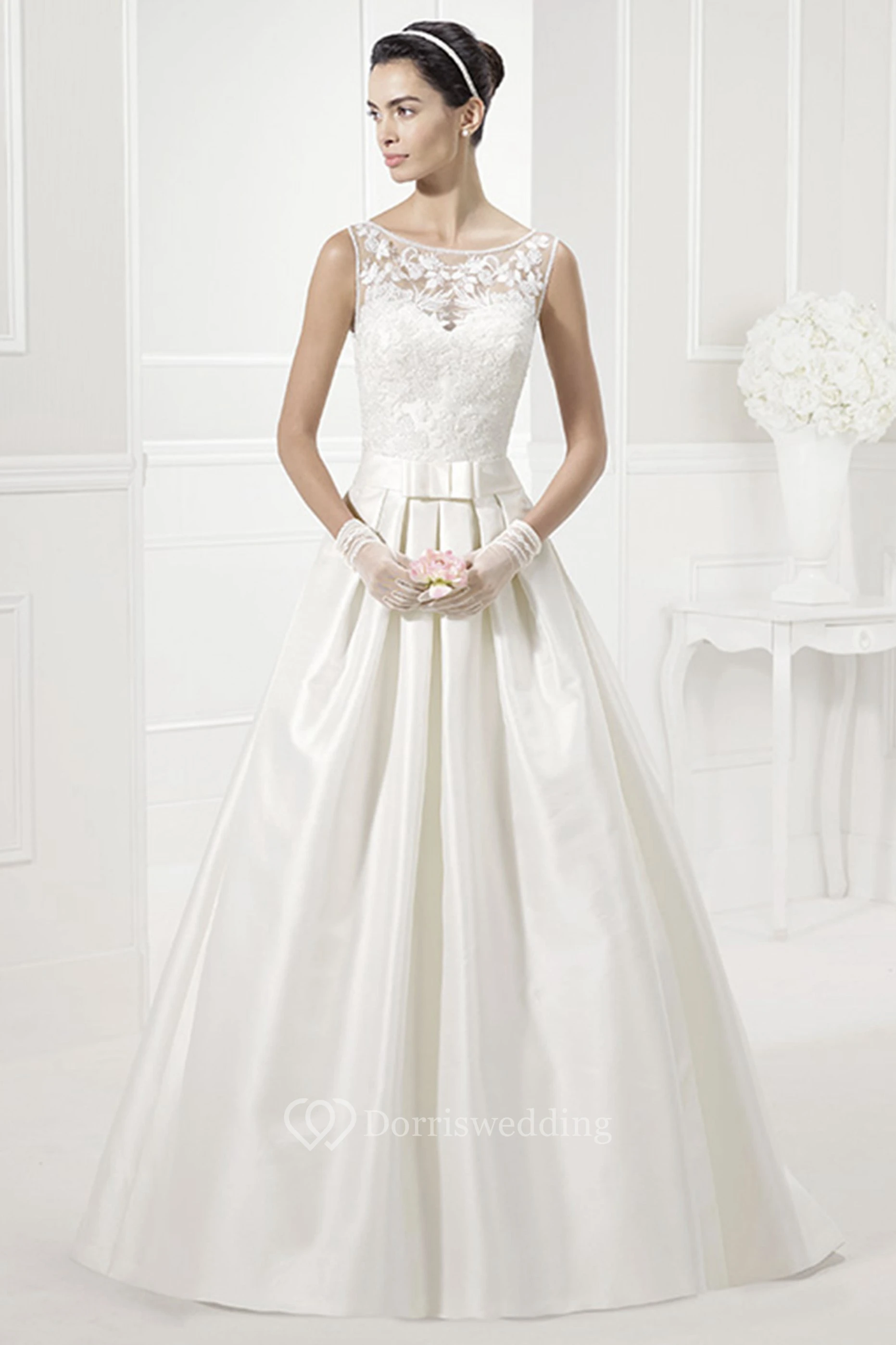 Jewel Neck Sleeveless Taffeta Bridal Gown With Lace Top And Bows