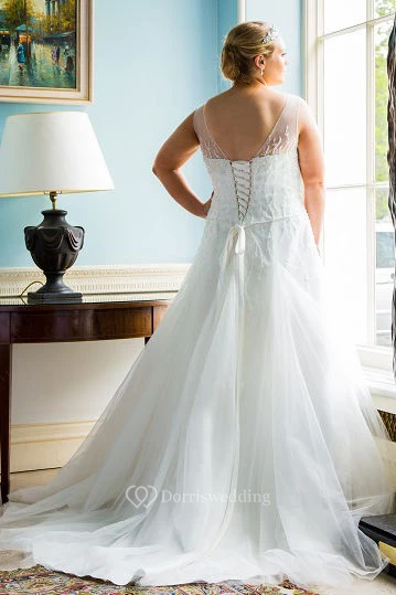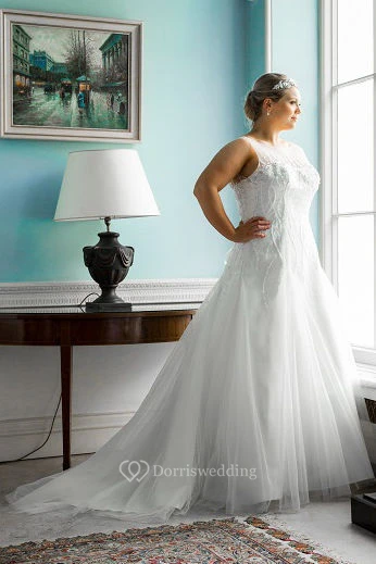 Jewel Neck Sleeveless Tulle Bridal Gown With Lace Up