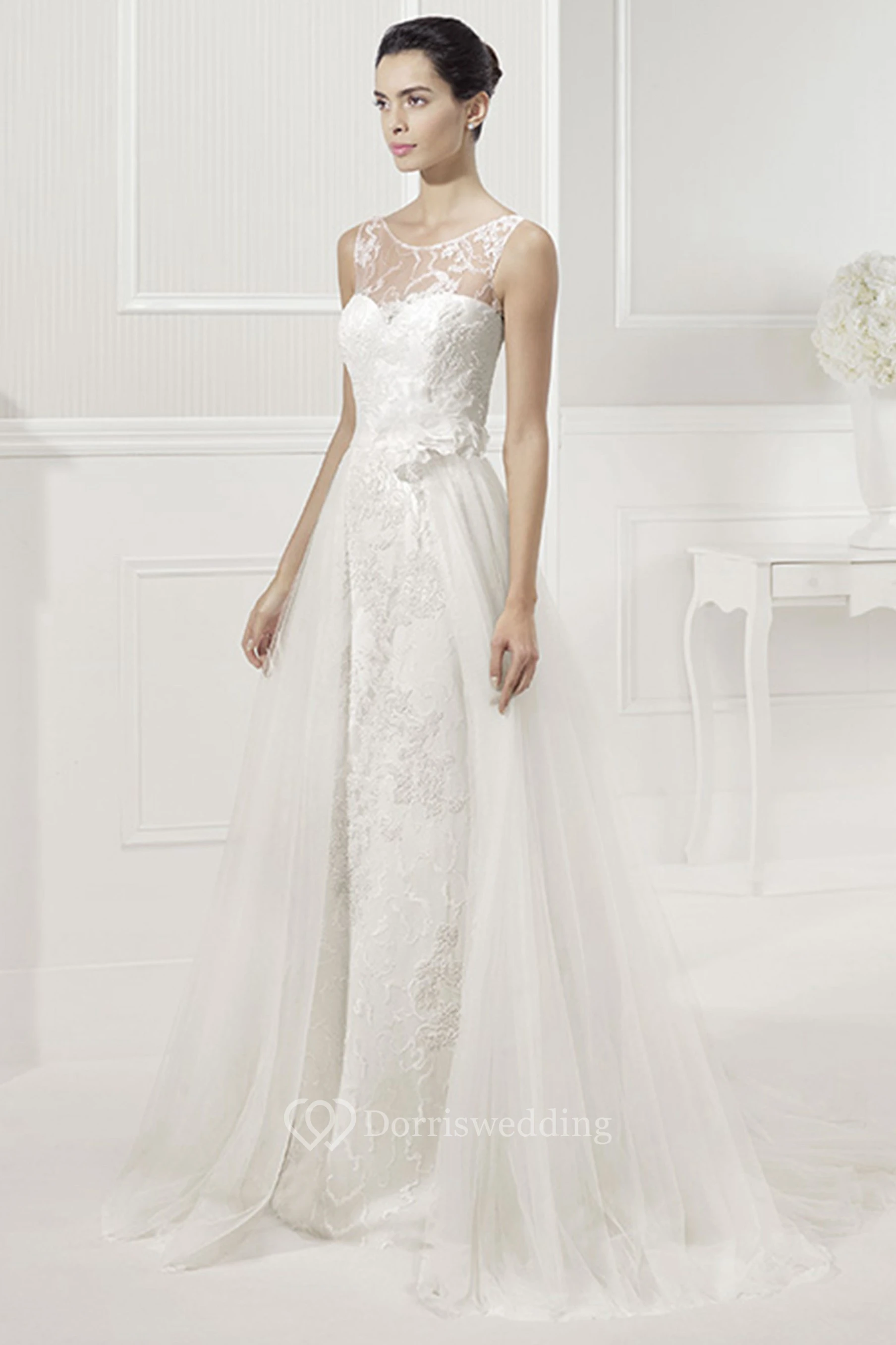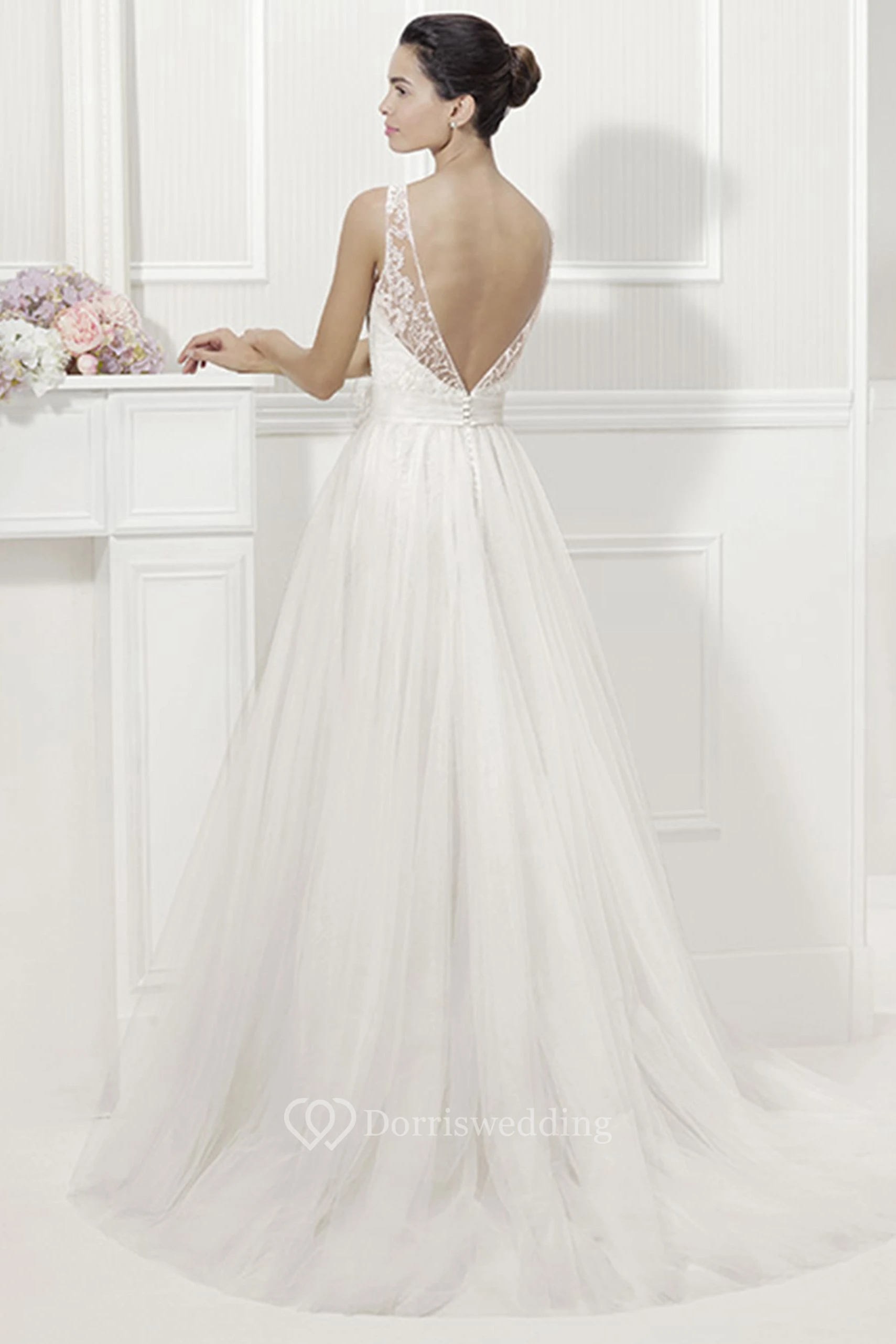 Jewel Neckline A-Line Tulle Bridal Gown With Lace And V Back