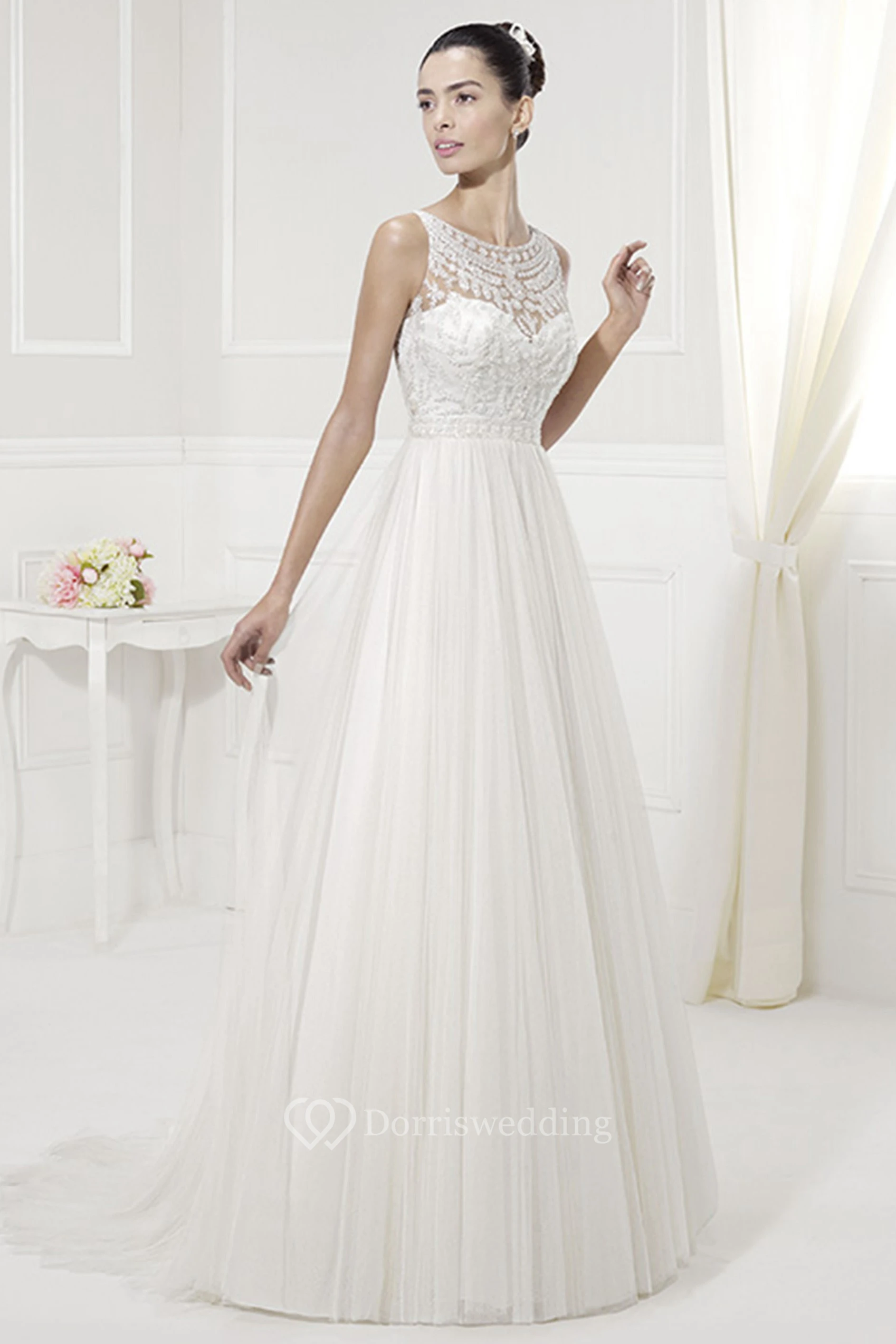 Jewel Neckline Appliqued Top Tulle Pleated Bridal Gown