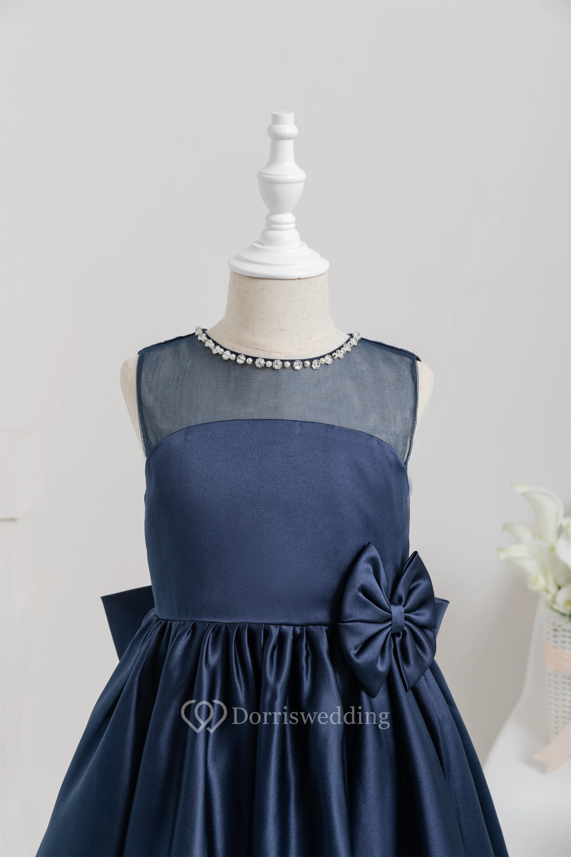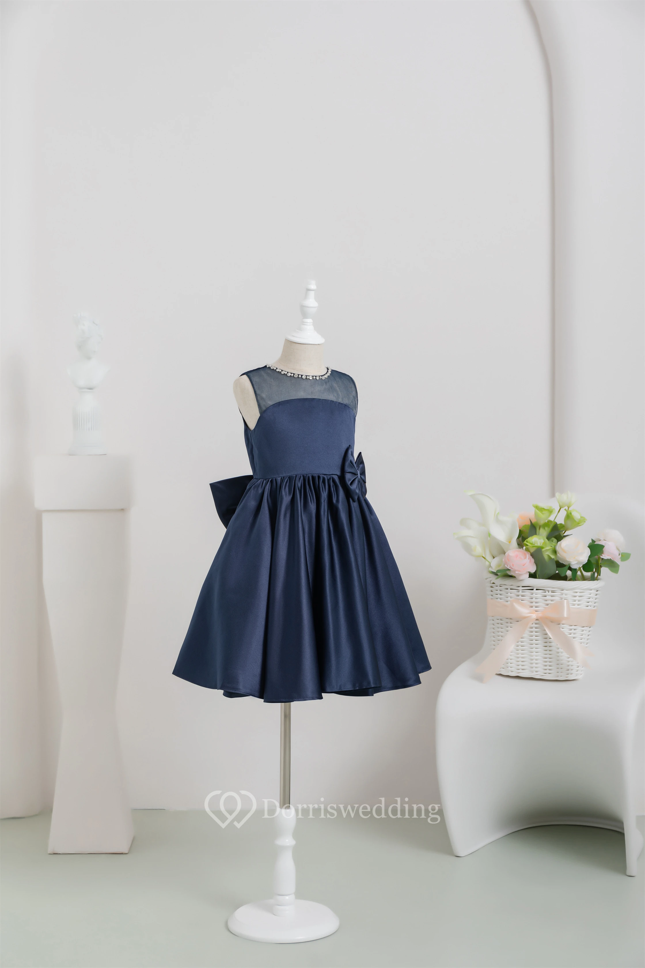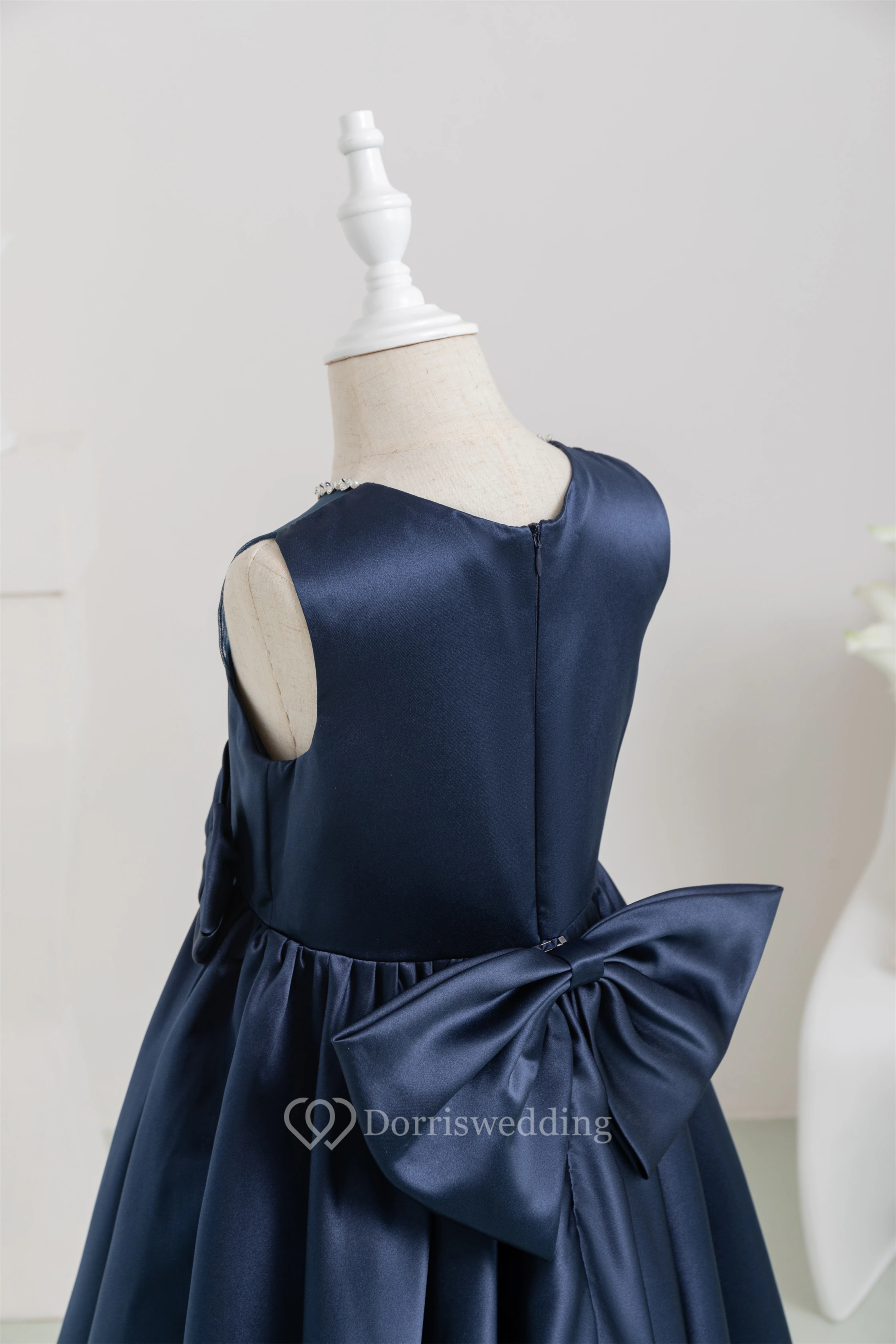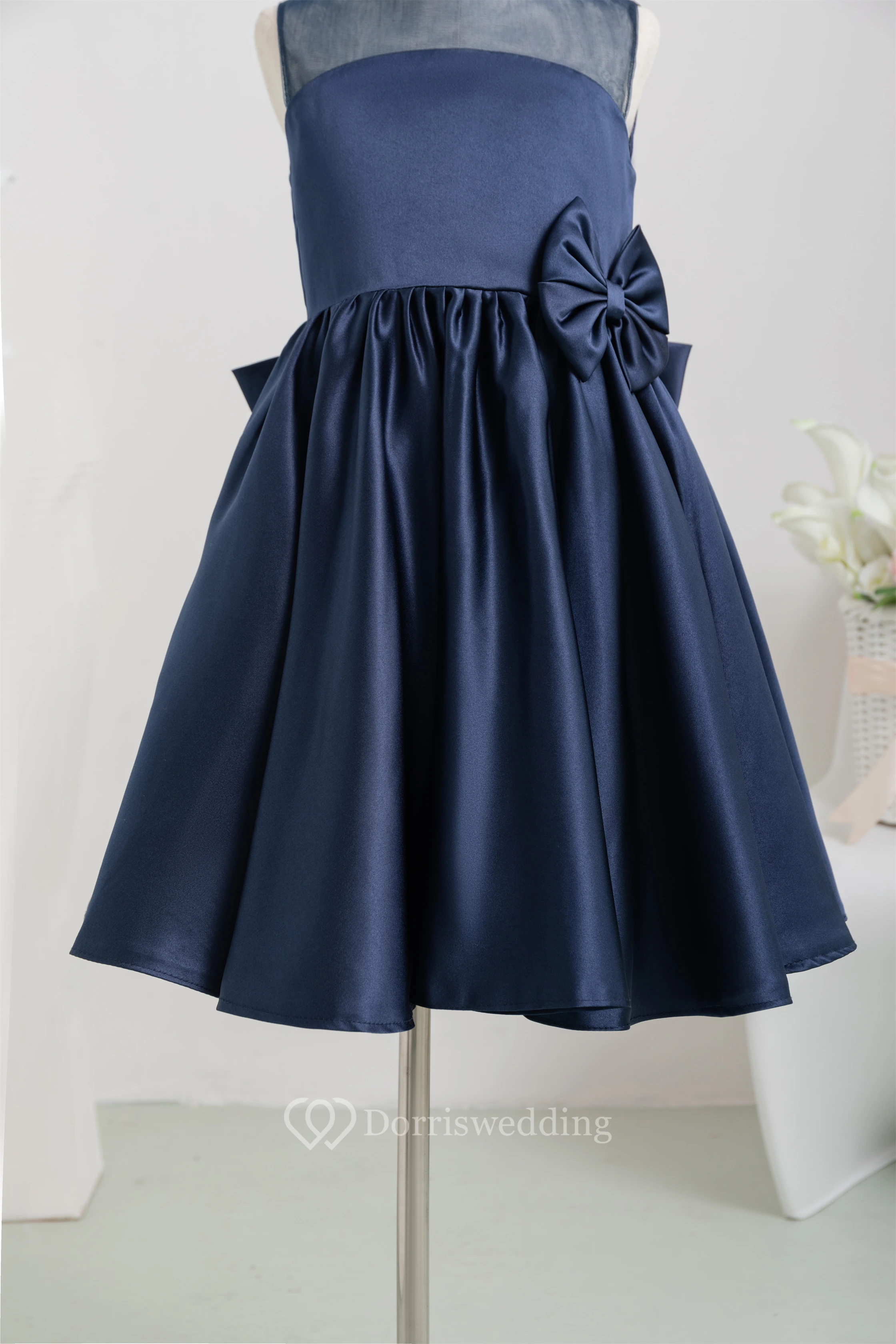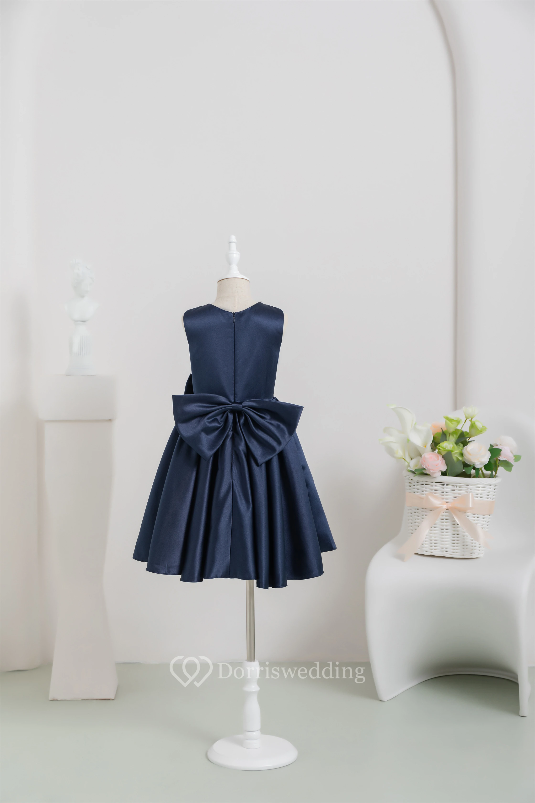 Jewel Satin Short A-line Bowed Dark Navy Flowergirl Dress