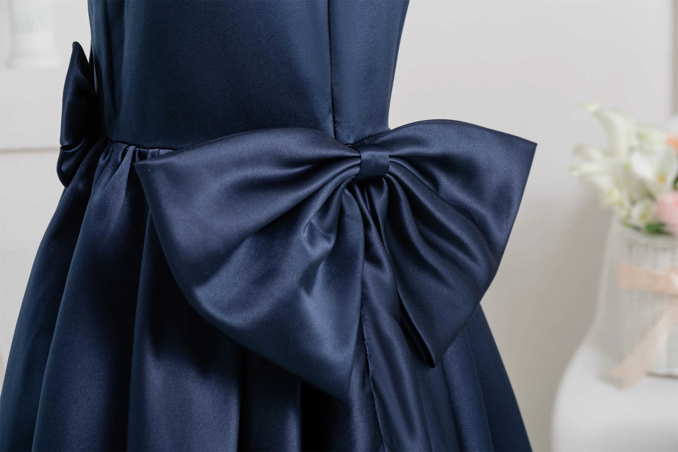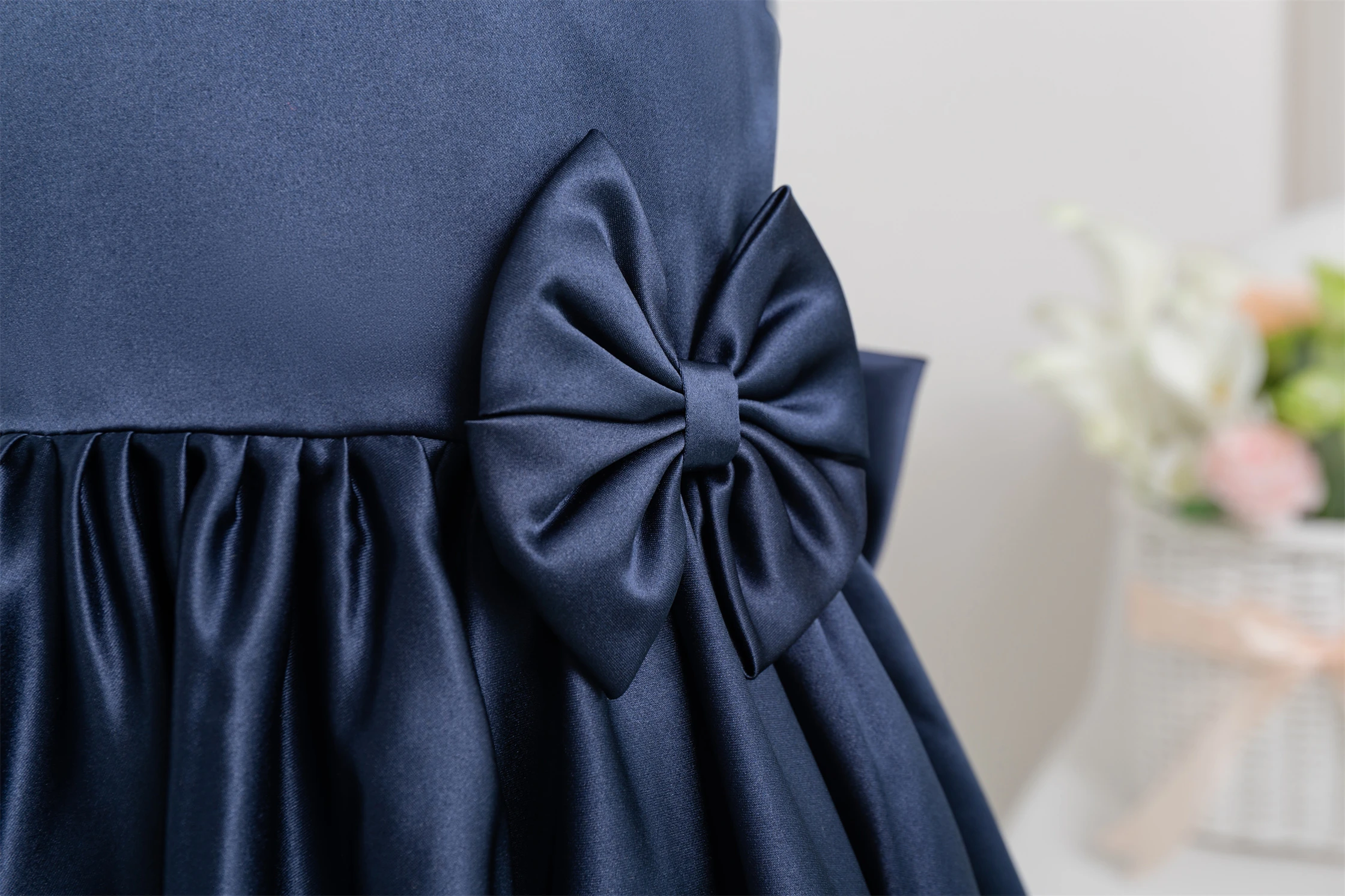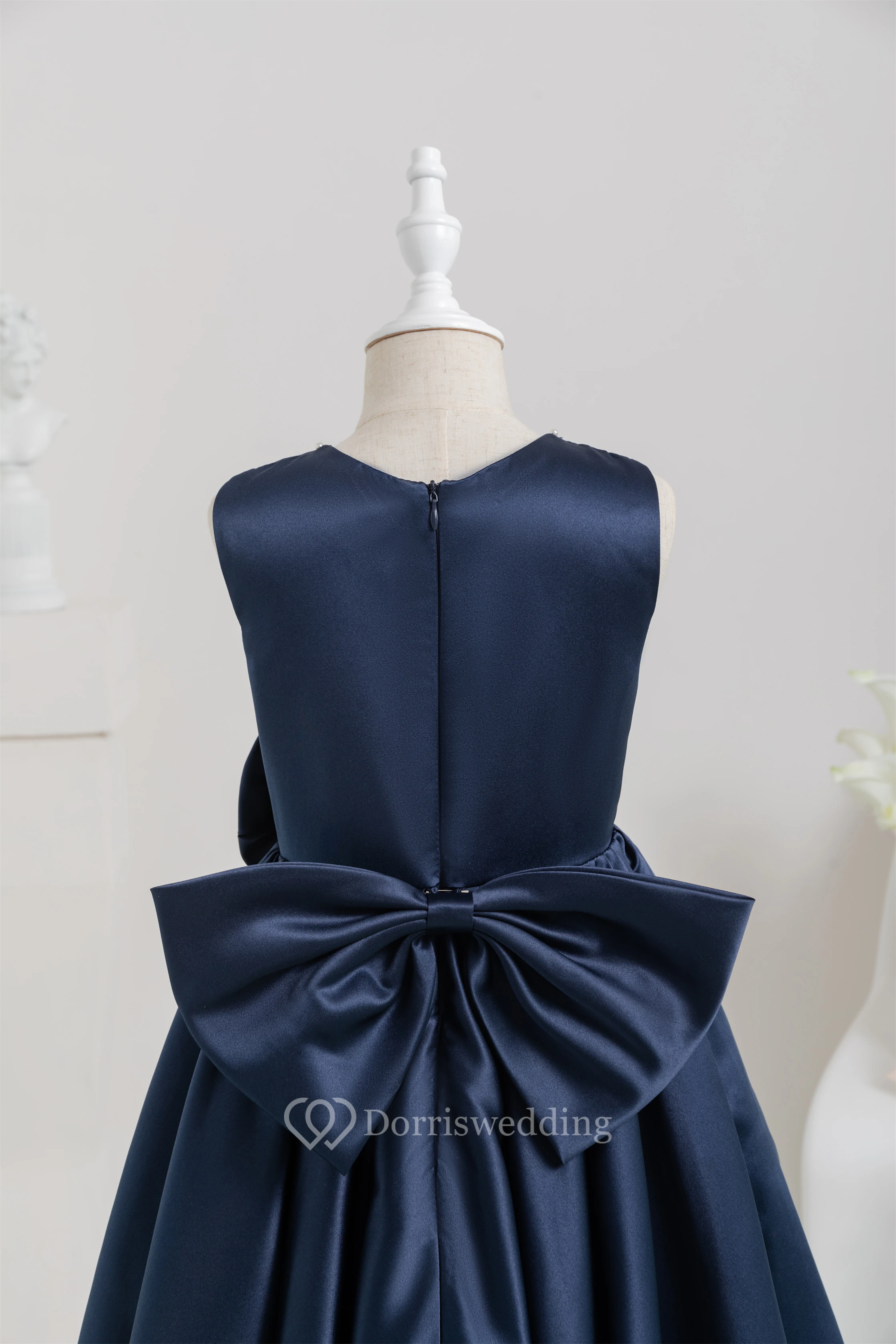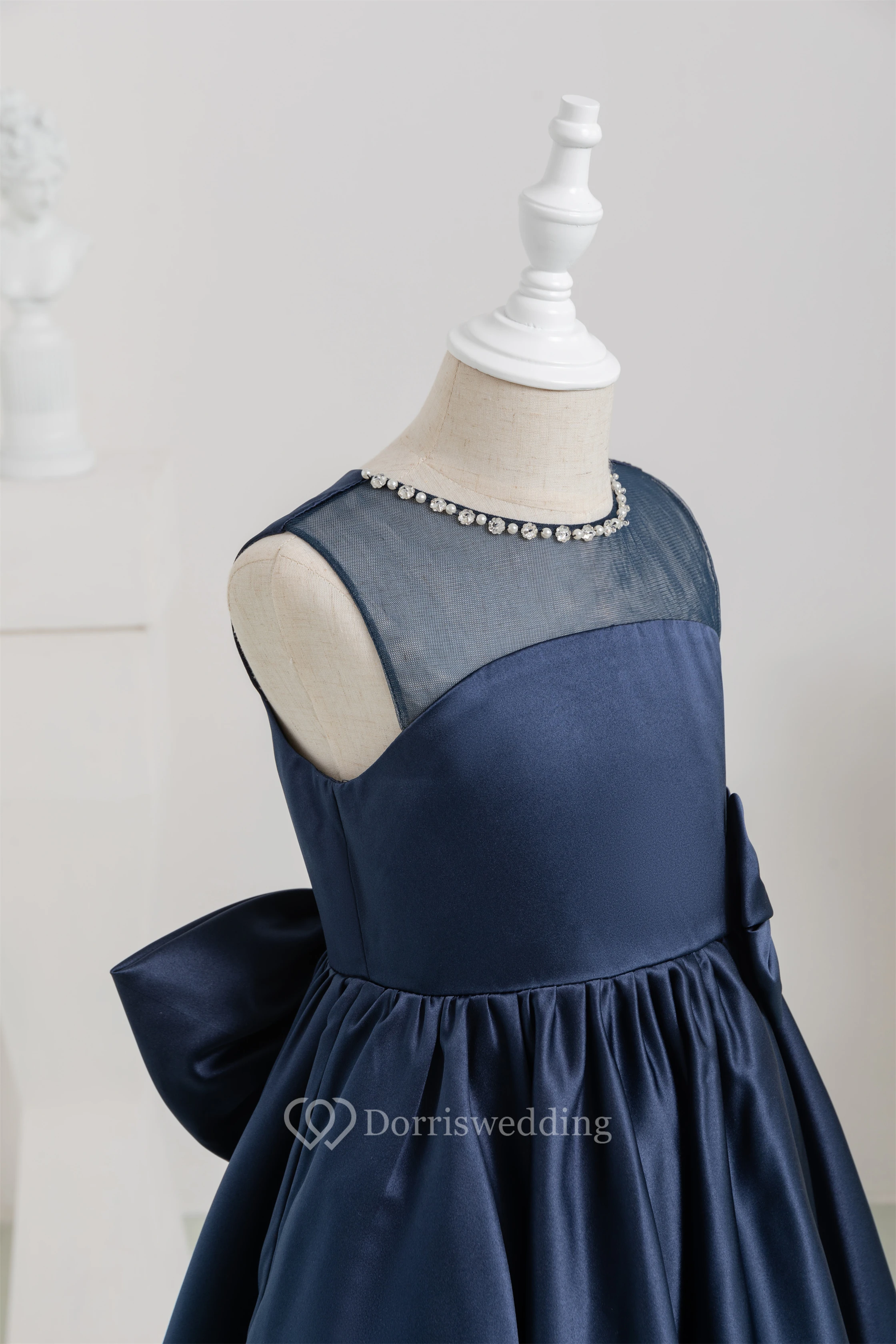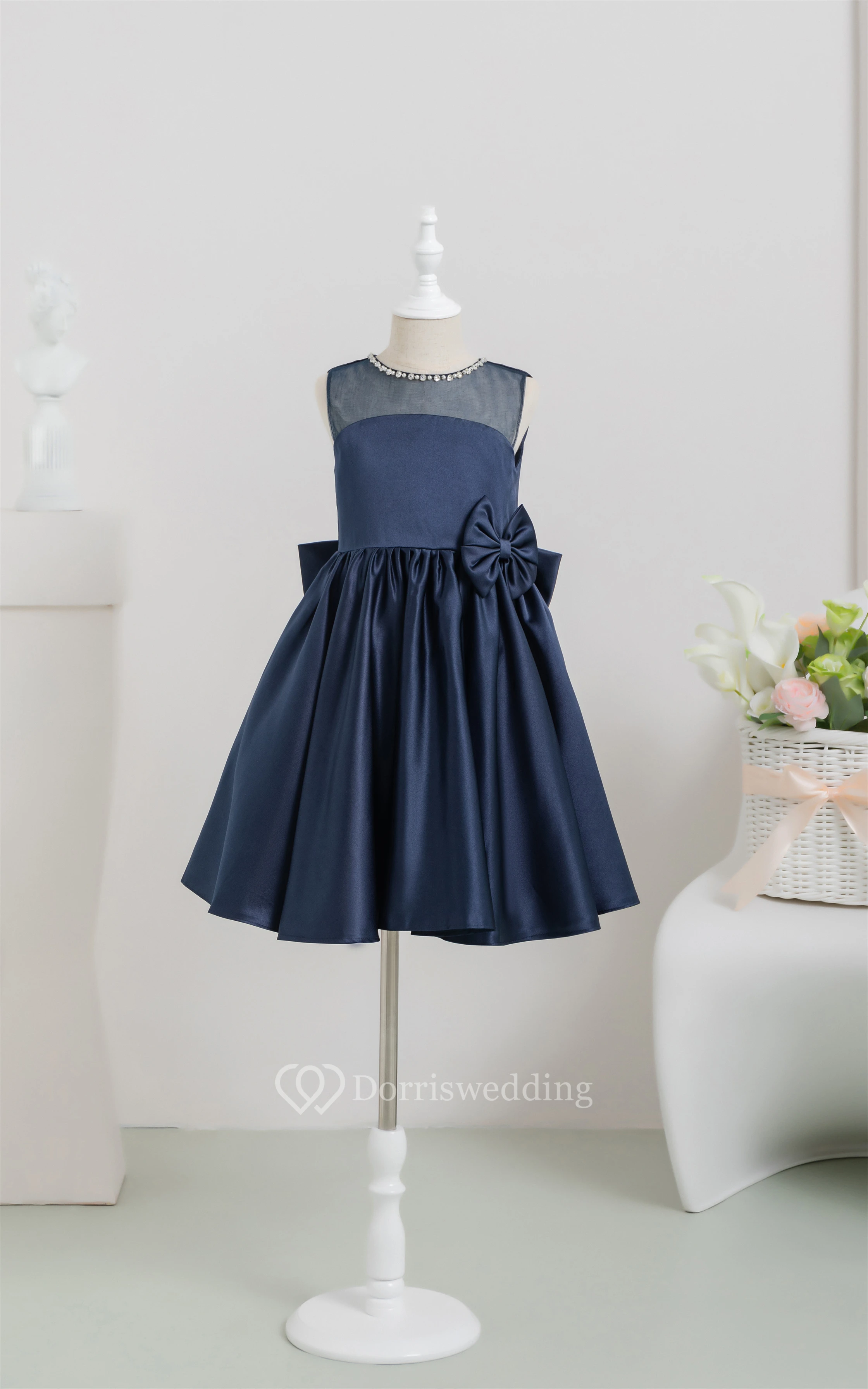 Jewel Satin Short A-line Bowed Dark Navy Flowergirl Dress