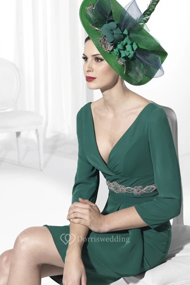 Jeweled 3-4-Sleeve Midi V-Neck Jersey Prom Dress With Draping
