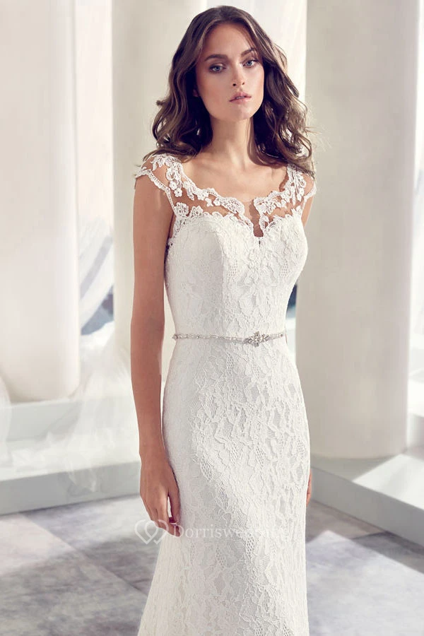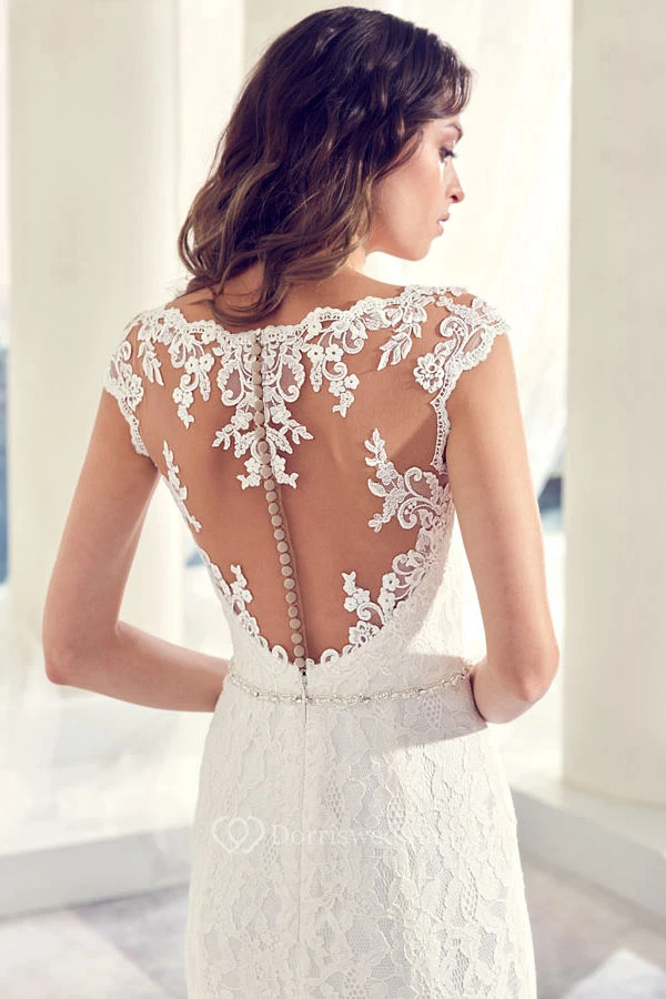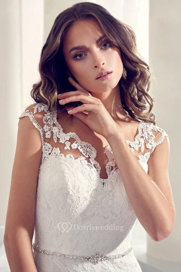 Jeweled V-Neck Cap Sleeve Lace Wedding Dress