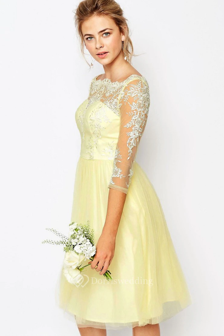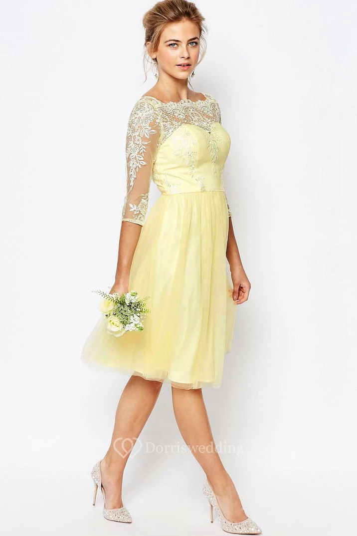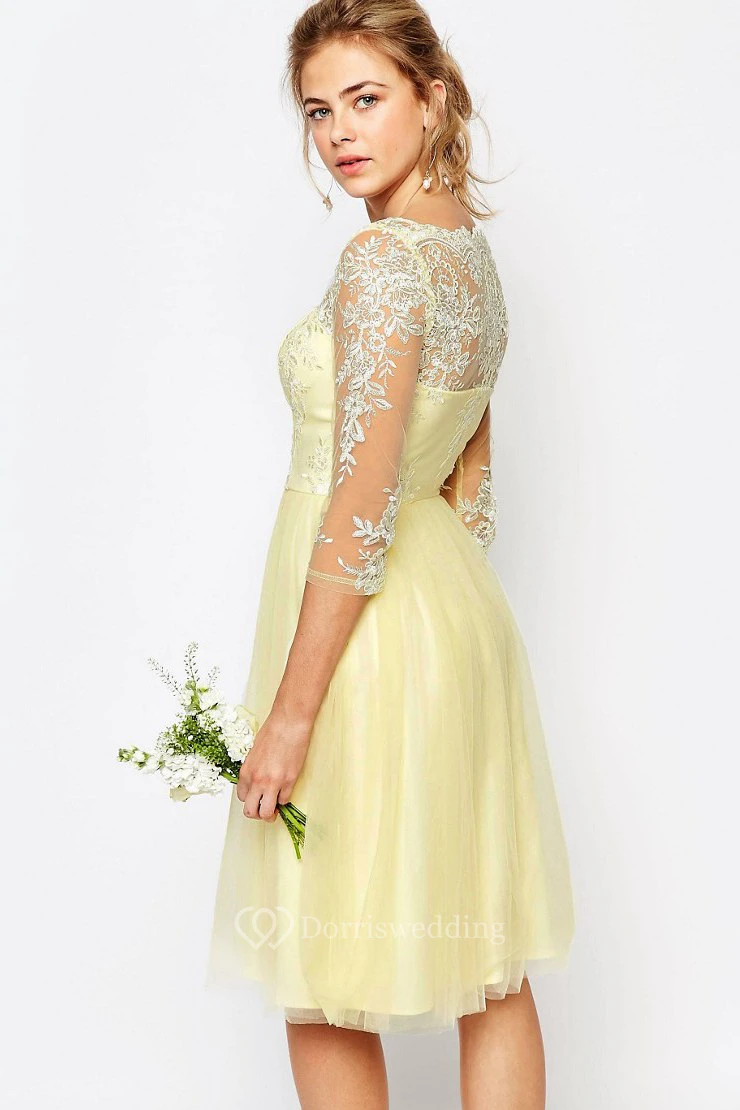 Knee-Length A-Line 3-4 Sleeve Appliqued High Neck Tulle Bridesmaid Dress