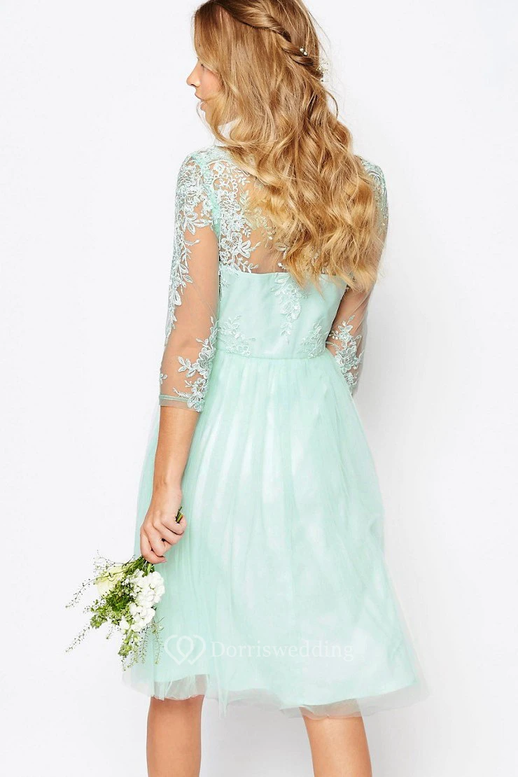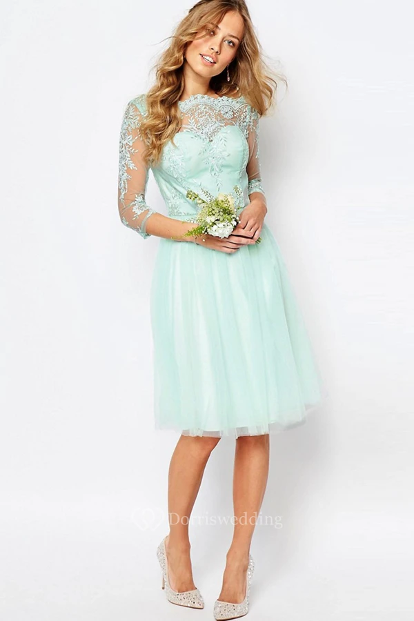 Knee-Length Appliqued Bateau Neck 3-4 Sleeve Tulle Bridesmaid Dress