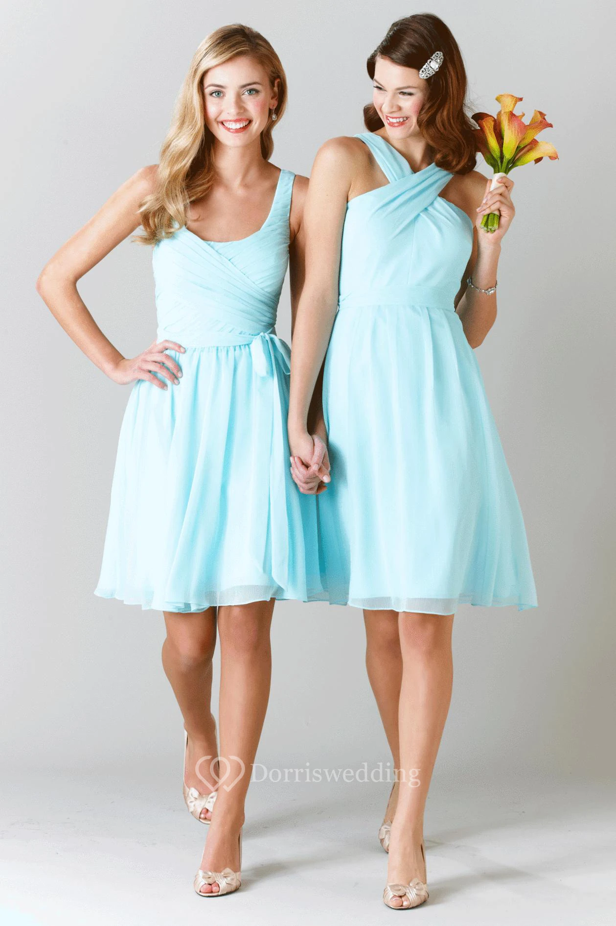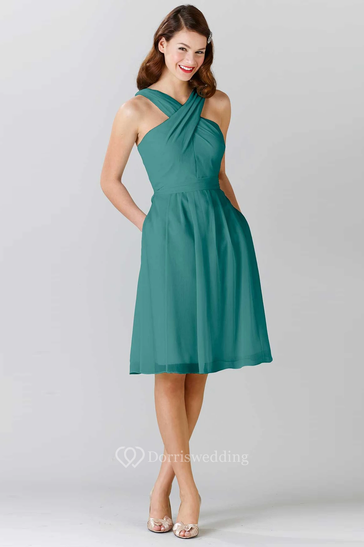 Knee-Length Halter Sleeveless Ruched Chiffon Bridesmaid Dress With Bow
