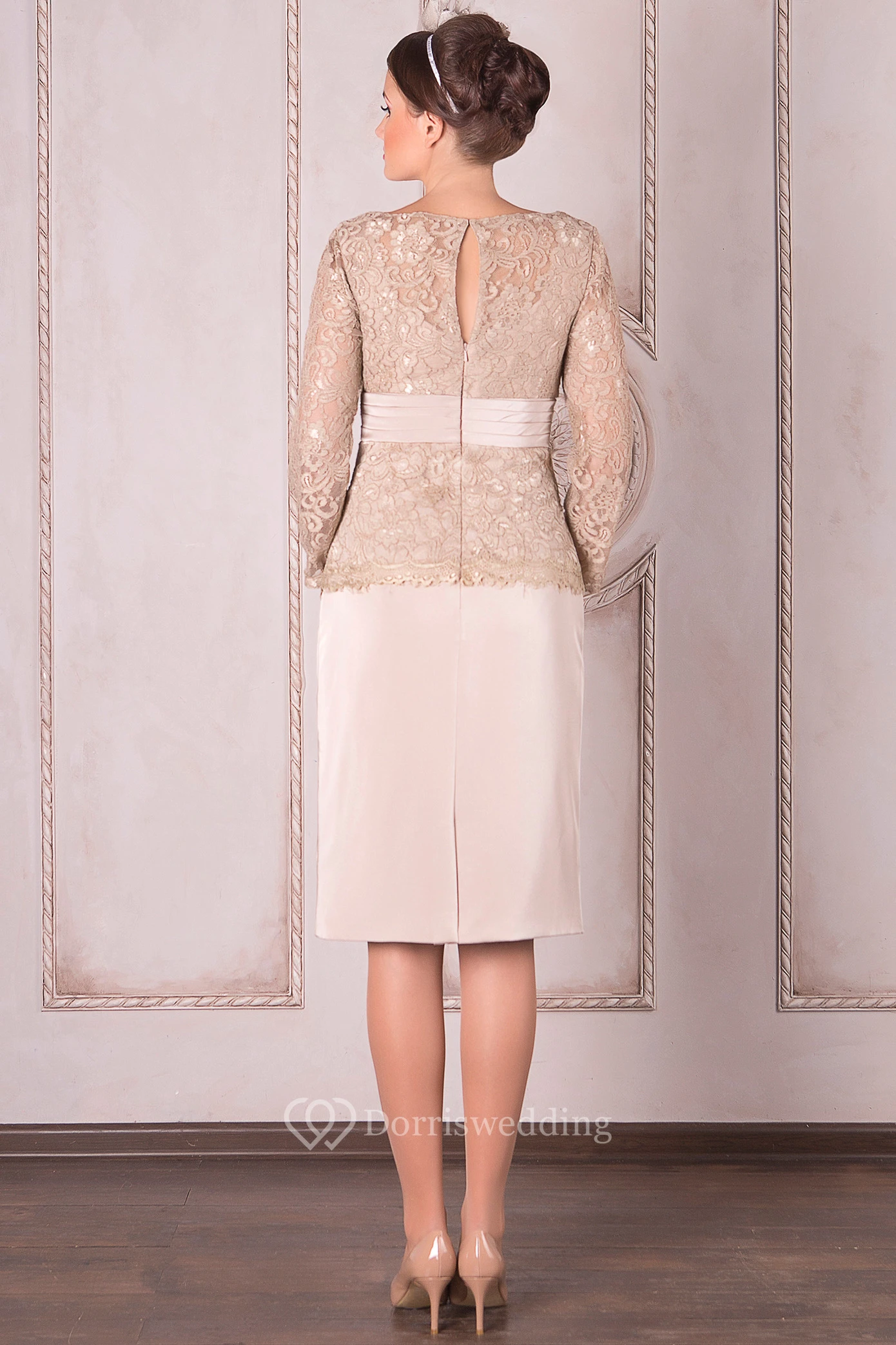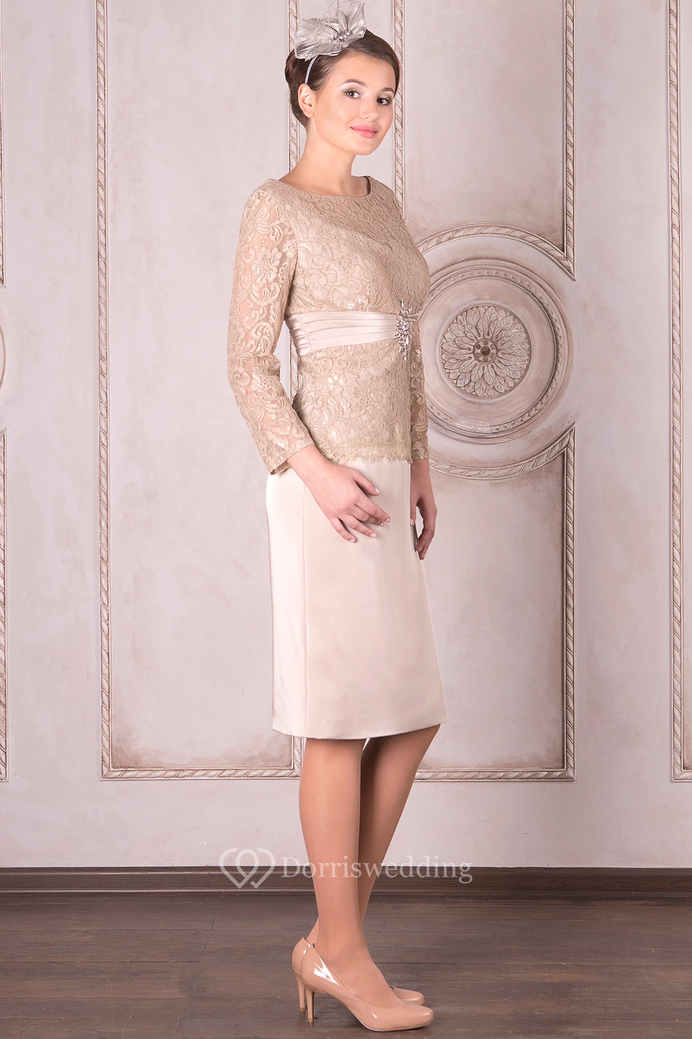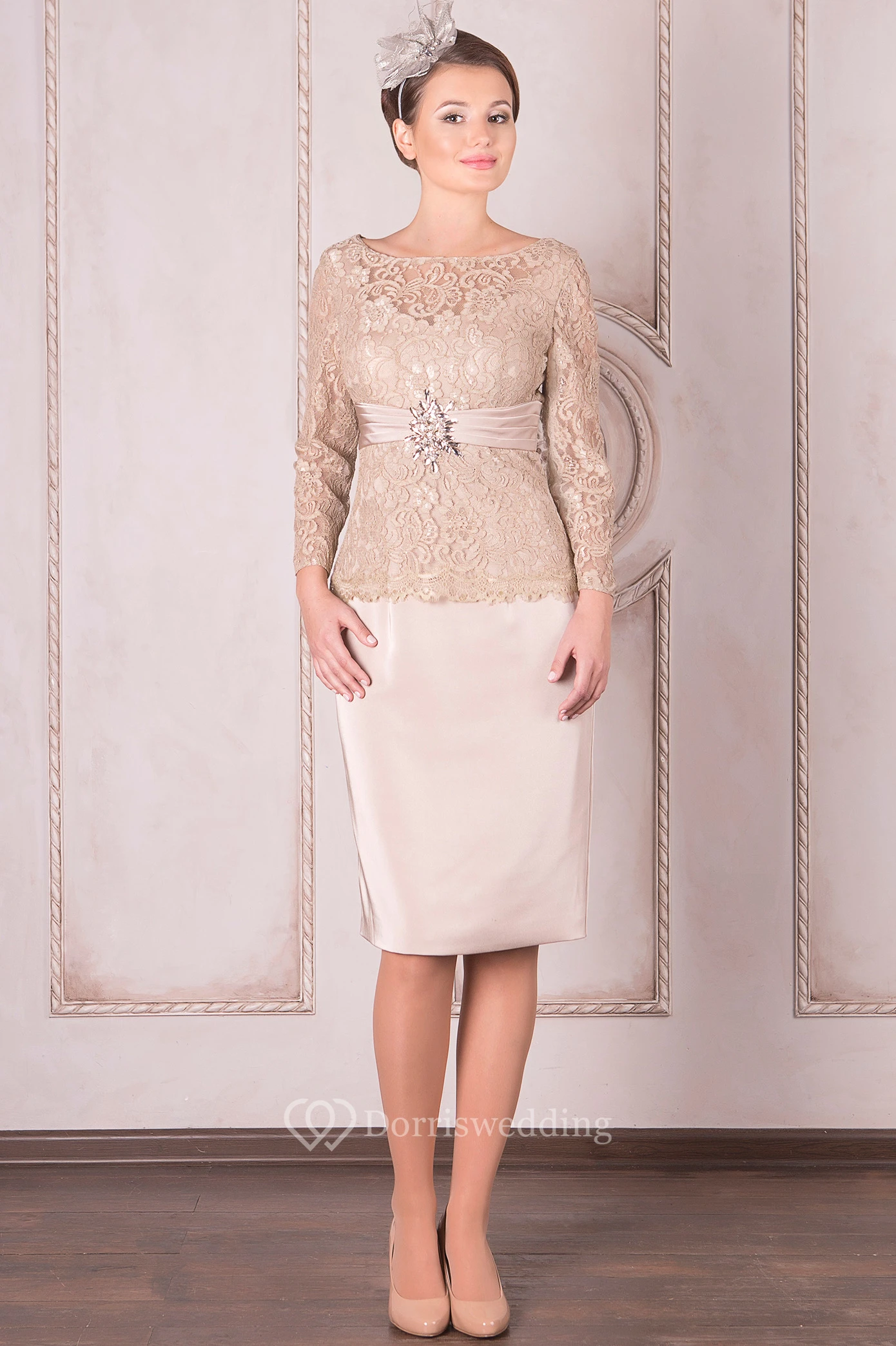 Knee-Length Pencil Appliqued Bateau Neck Long Sleeve Satin Mother Of The Bride Dress