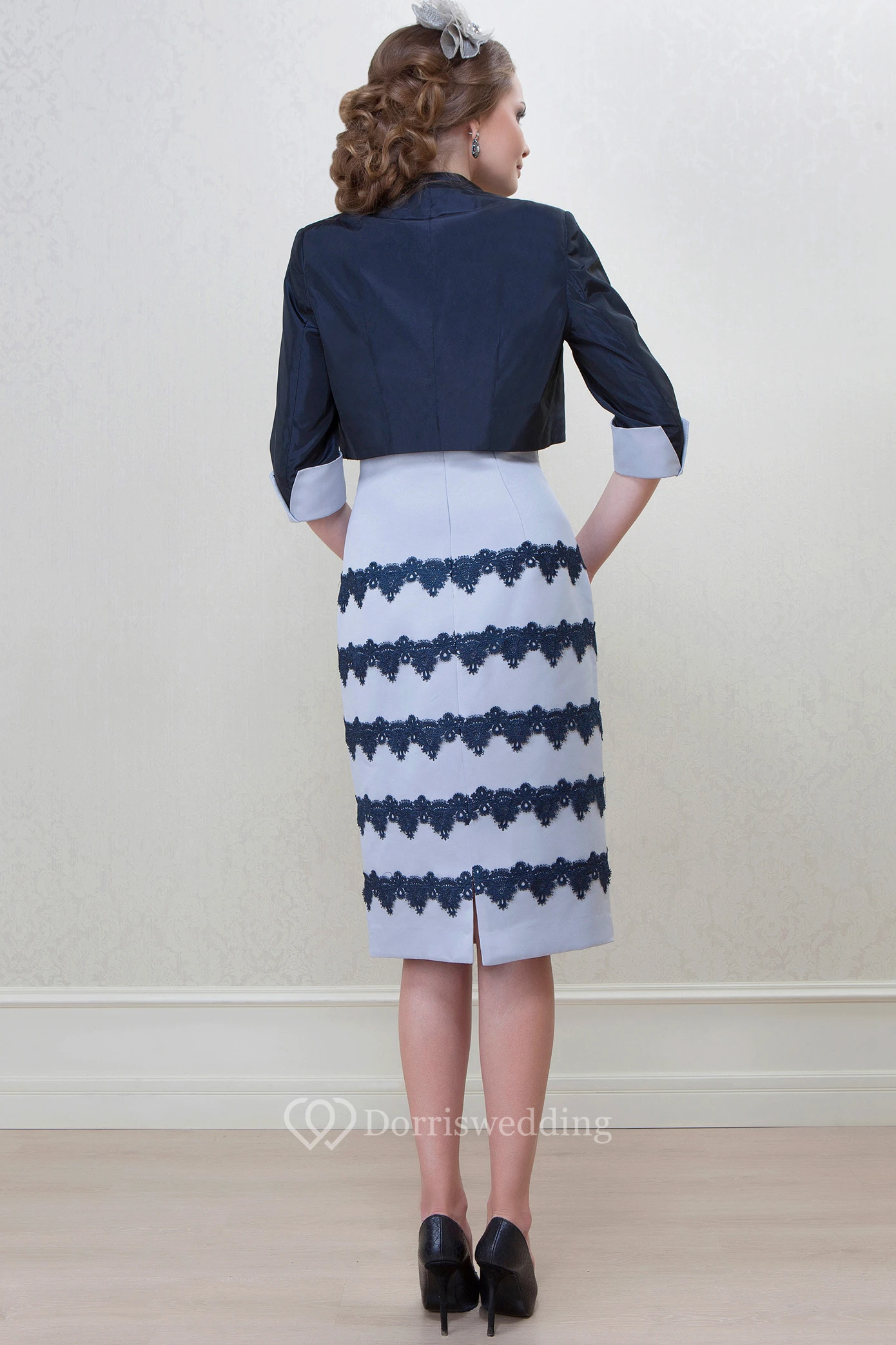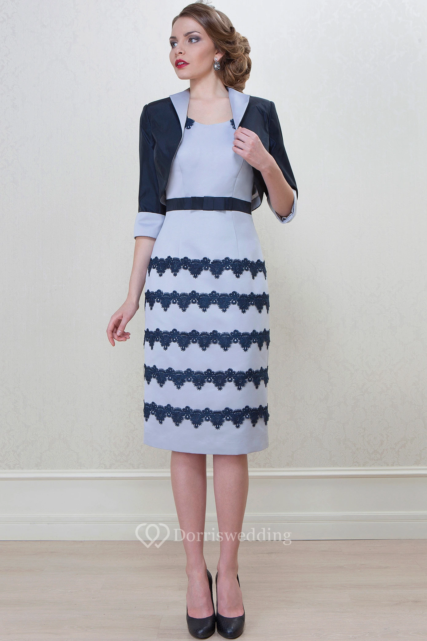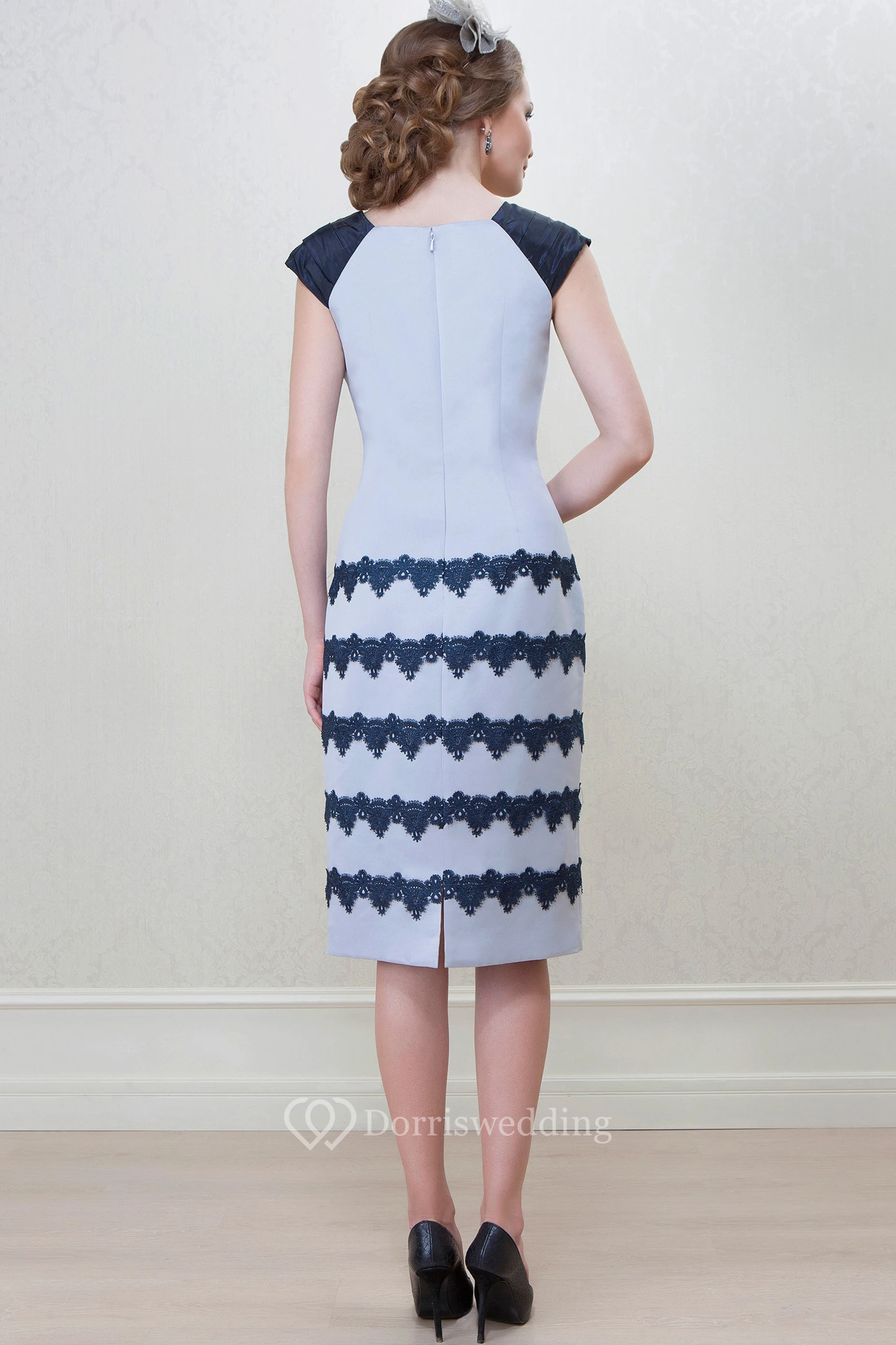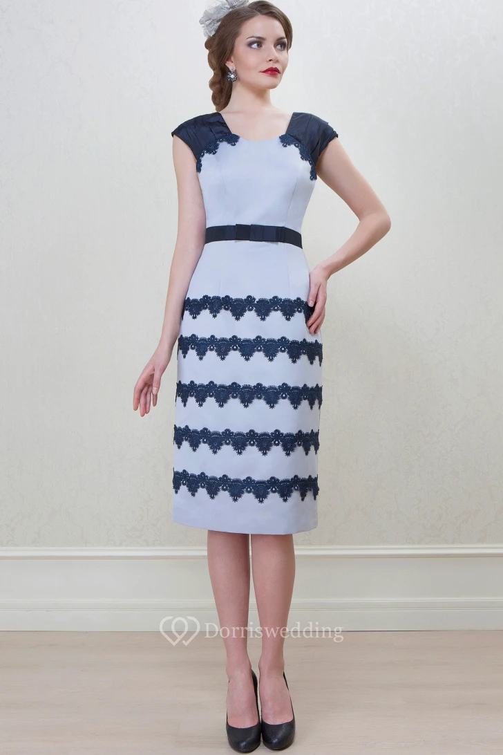 Knee-Length Pencil Square Neck Cap Sleeve Appliqued Satin Mother Of The Bride Dress