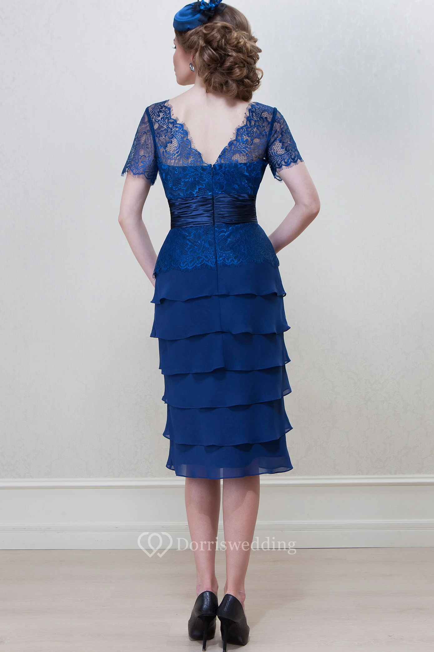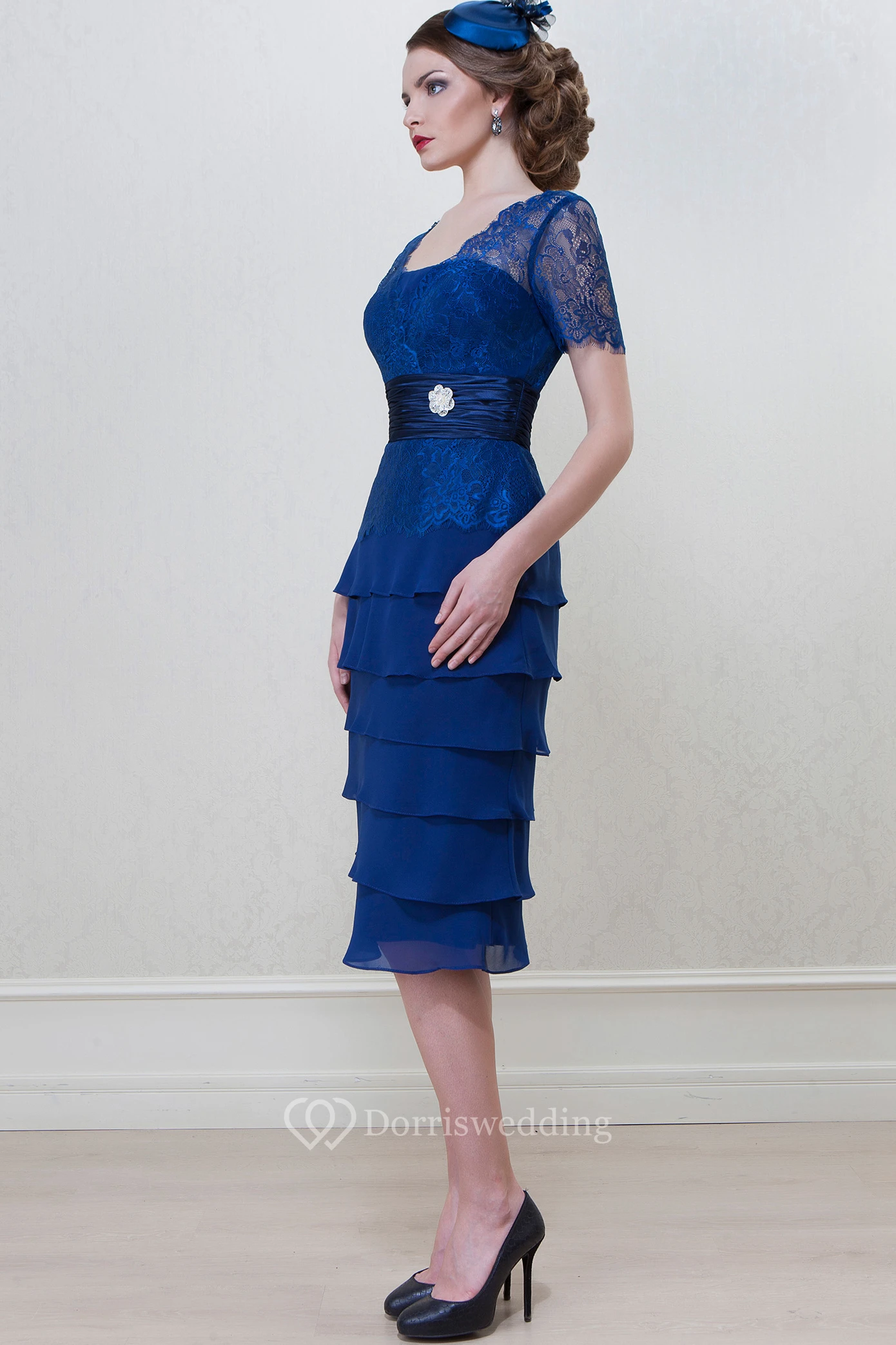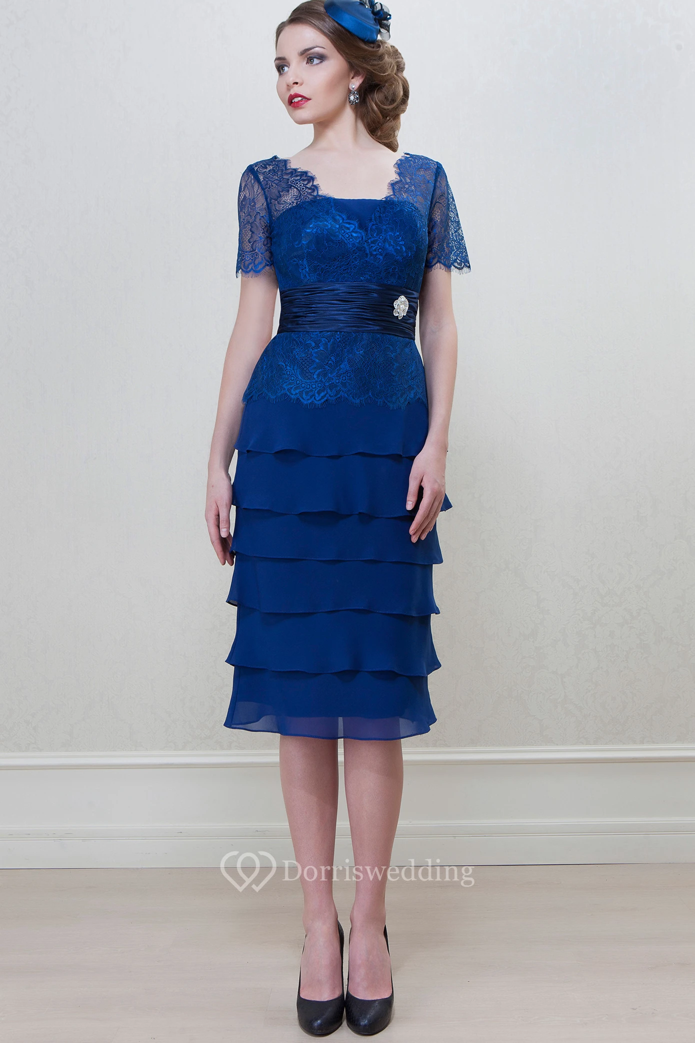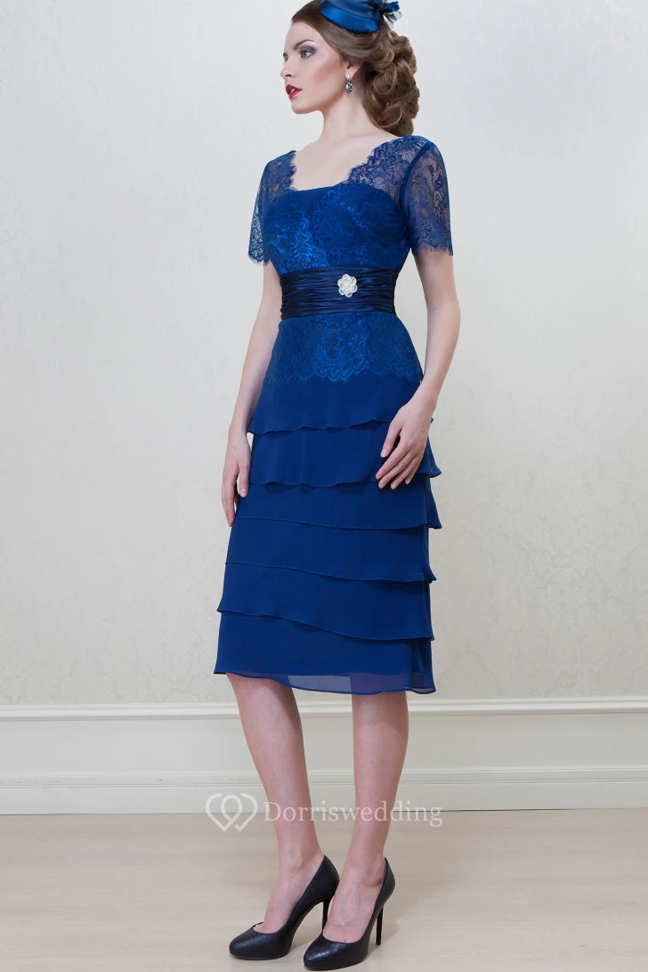 Knee-Length Short Sleeve Square Neck Tiered Chiffon Mother Of The Bride Dress