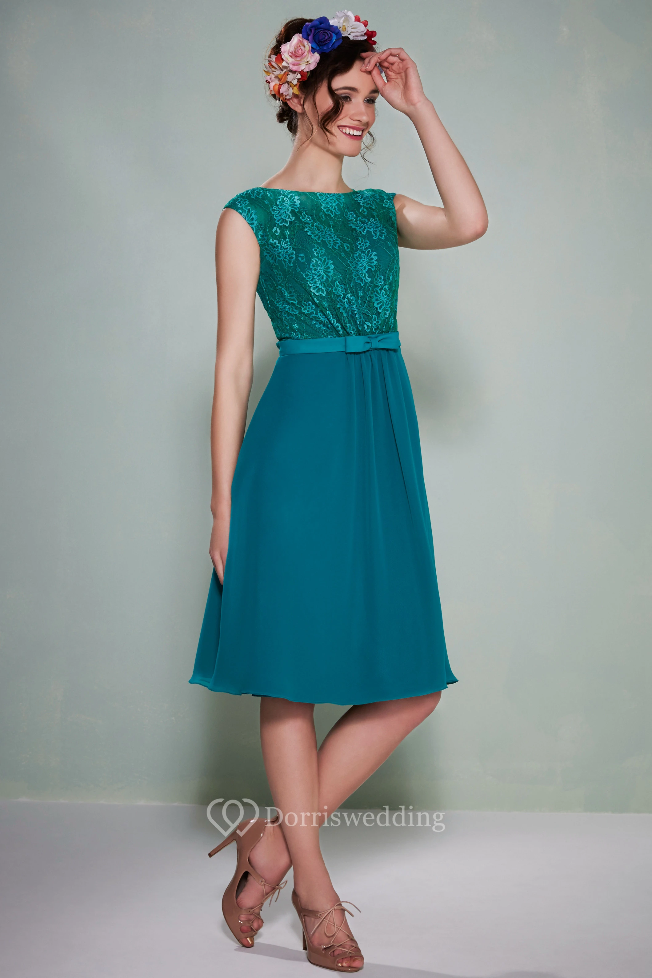 Knee-Length Sleeveless Lace Bateau Neck Chiffon Bridesmaid Dress With Bow