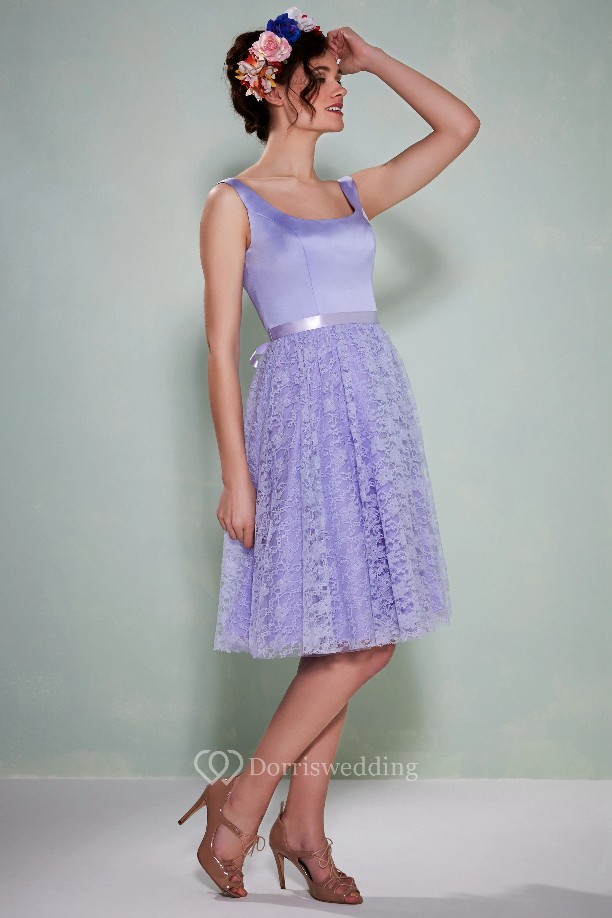 Knee-Length Sleeveless Square Neck Lace Satin Bridesmaid Dress