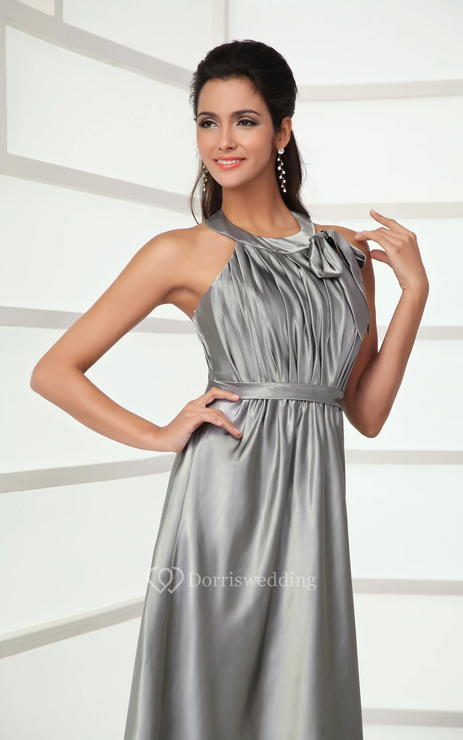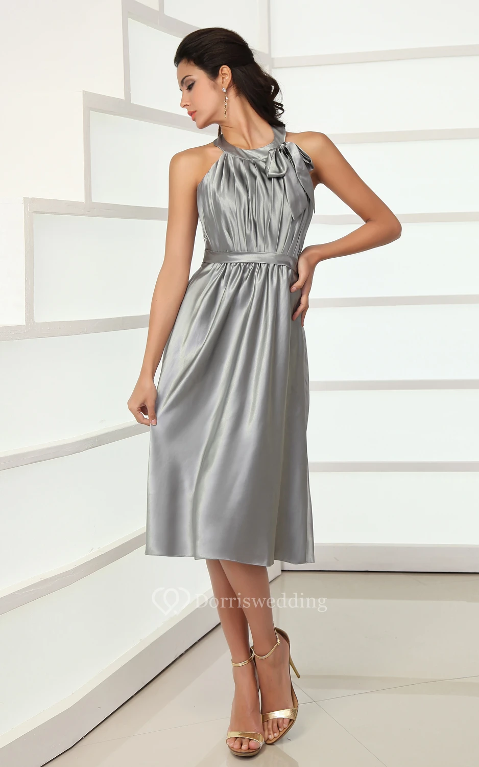 Knee-Length Stretched Satin Dress With Bow and Pleating