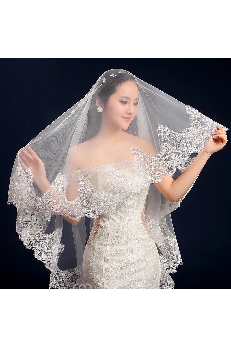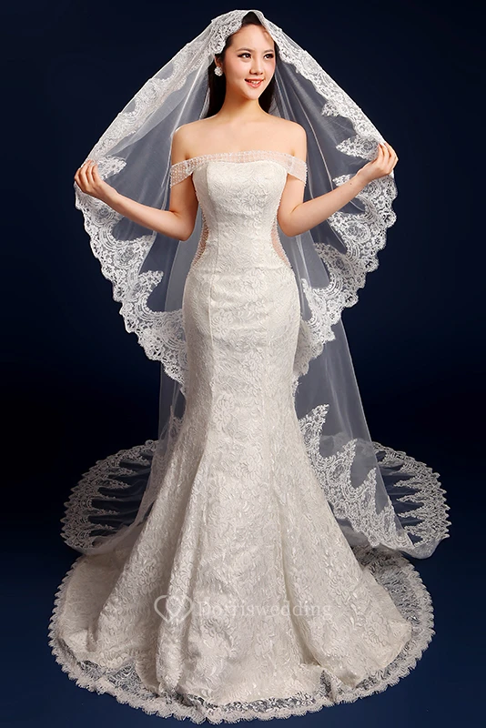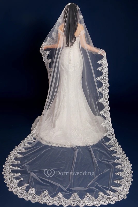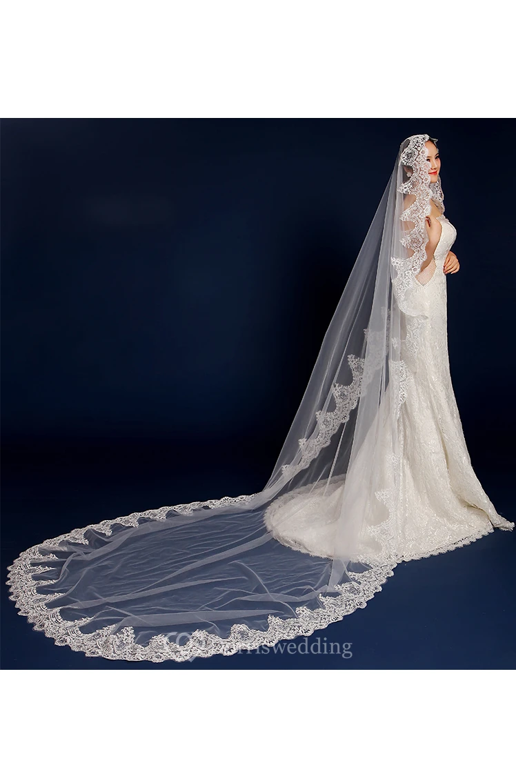 Korean Style Cathedral Wedding Veil with Exquisite Lace Edge