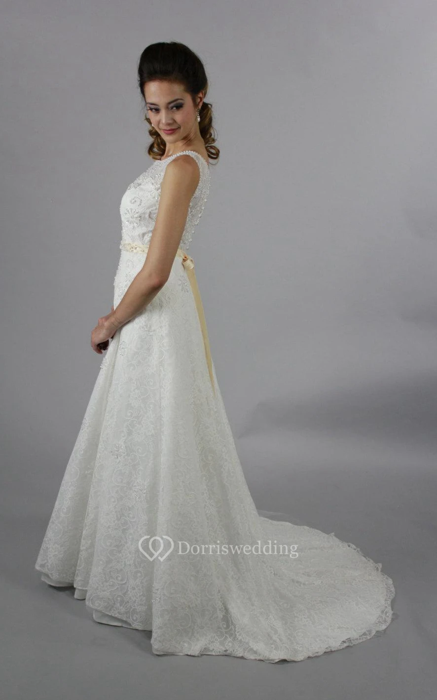 Lace A-Line Sleeveless Bateau Neck Dress With Beaded Waistbelt