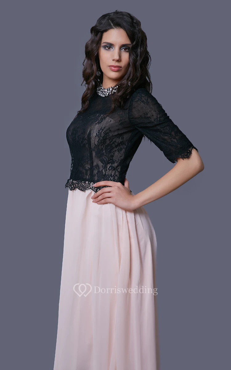 Lace and Chiffon A-Line Floor Length Dress With Half Sleeves and Jeweled Neck