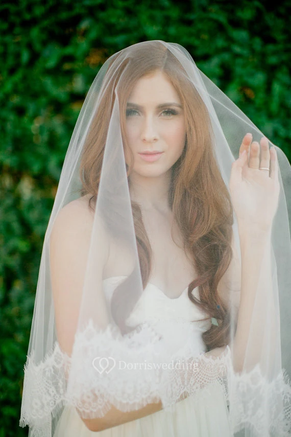 Lace Applique Long Trailing Soft Veil with Lace Edge