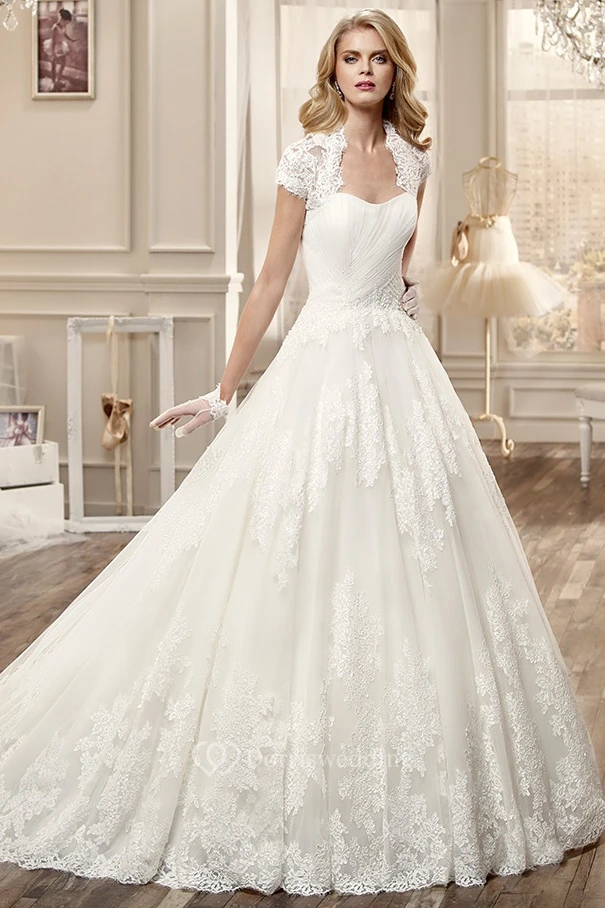 Lace-Applique Long Wedding Dress With T-Shirt Sleeve And Brush Train