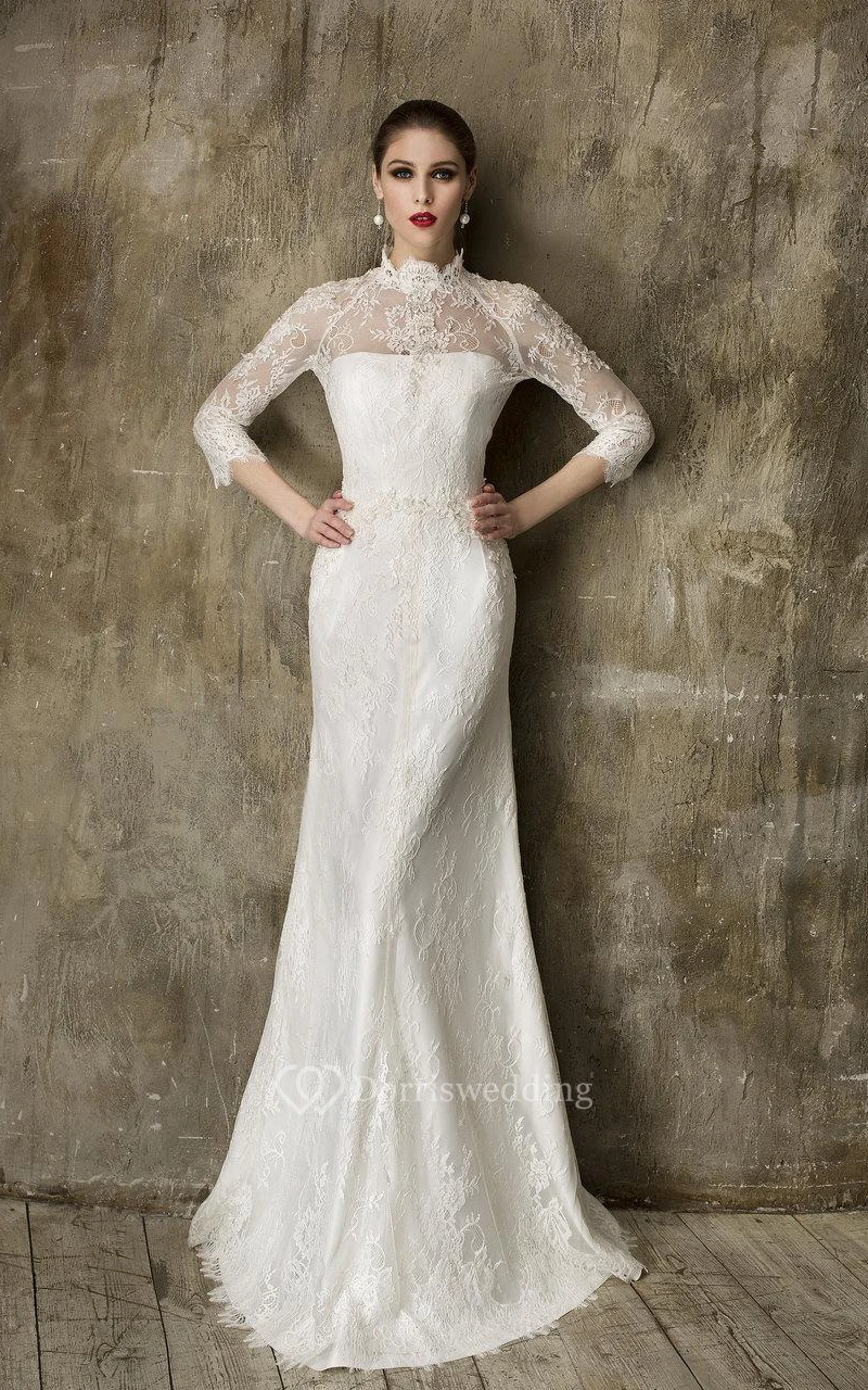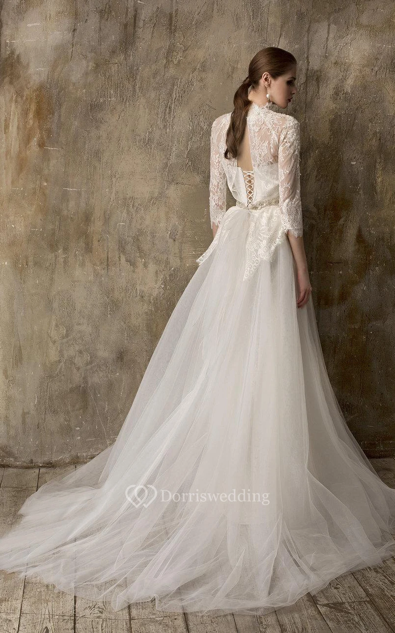Lace Bodice High Neck 3-4 Sleeve Tulle Skirt Dress With Beadings