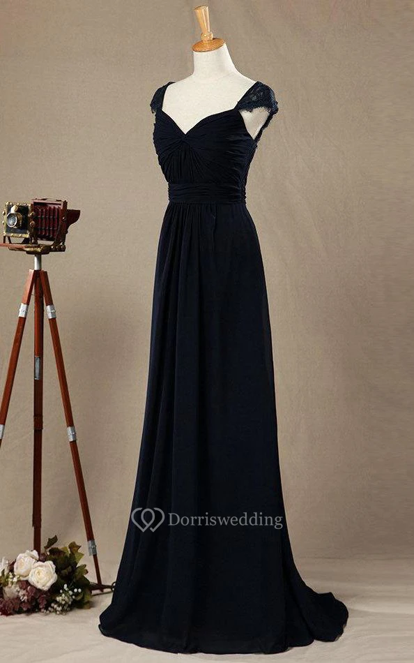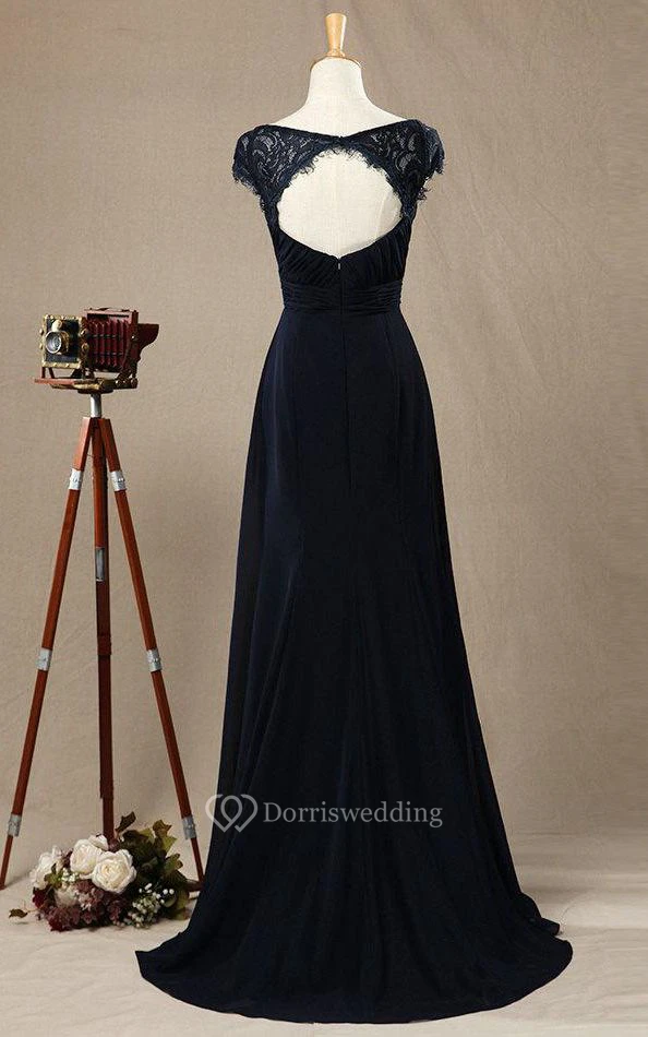 Lace Cap Sleeve A-line Chiffon Long Dress With Back Keyhole