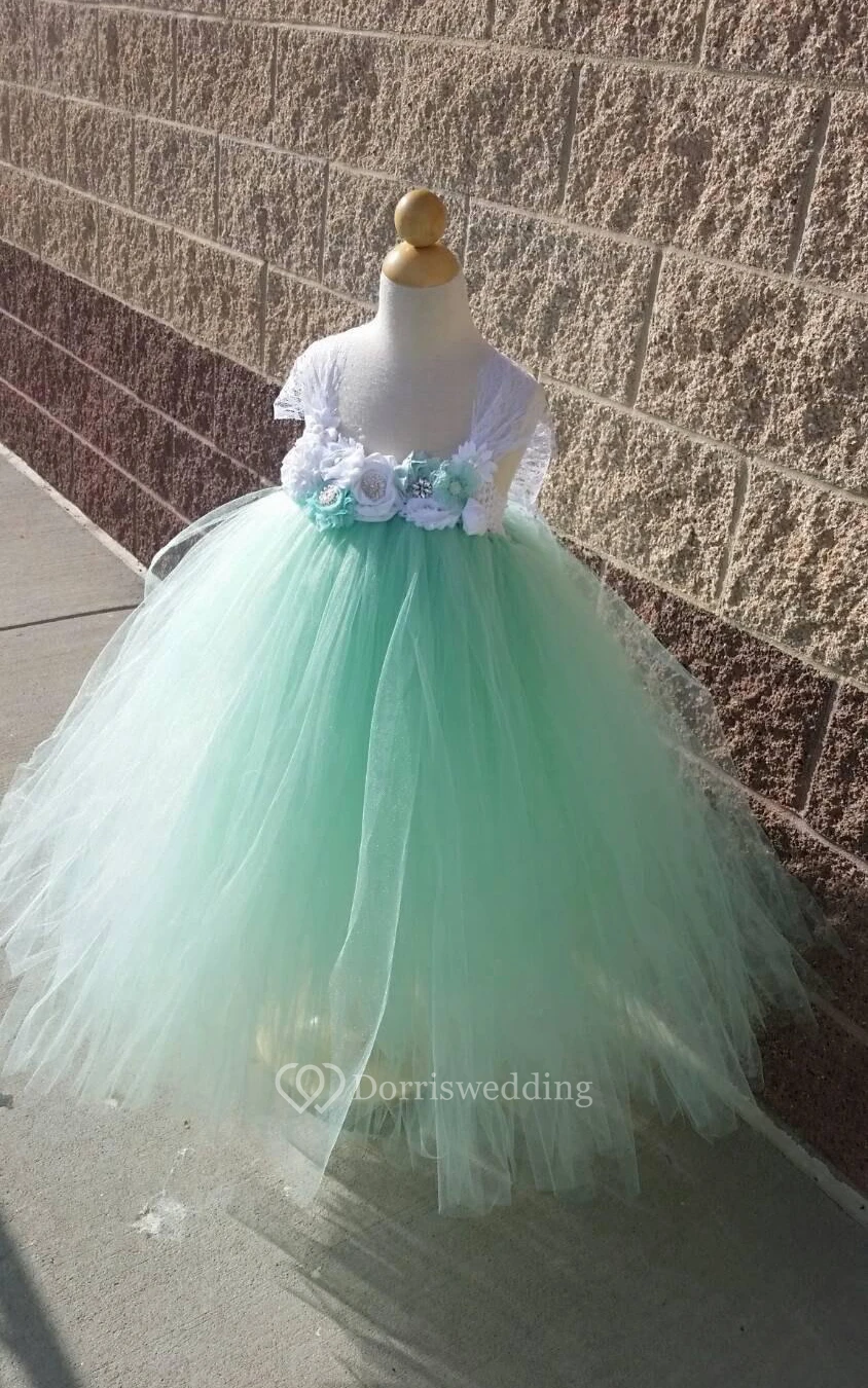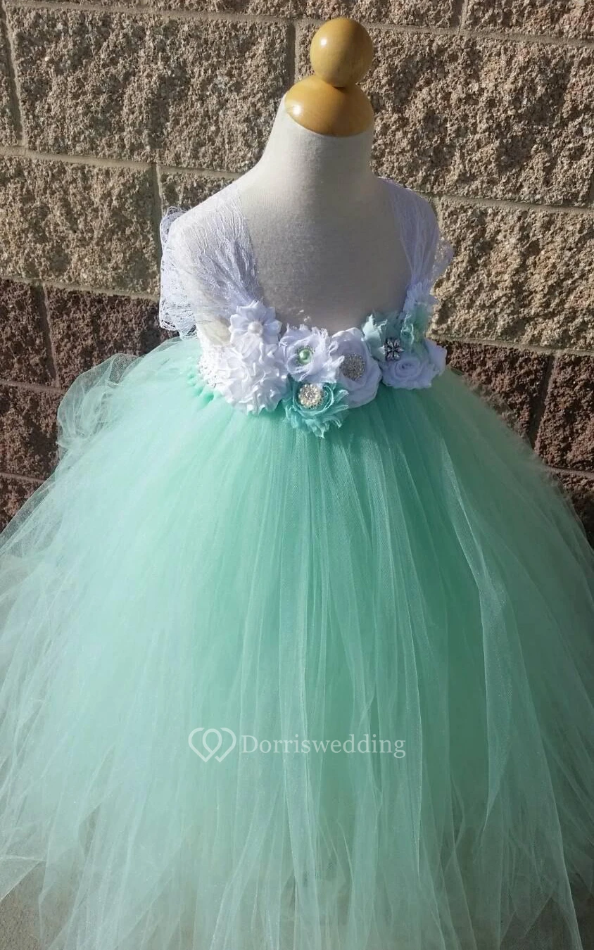 Lace Cap Sleeve Floral Empire Waist Tulle Ball Gown With Ruffles and Sash