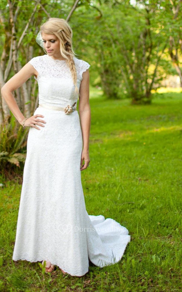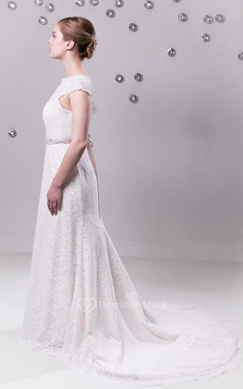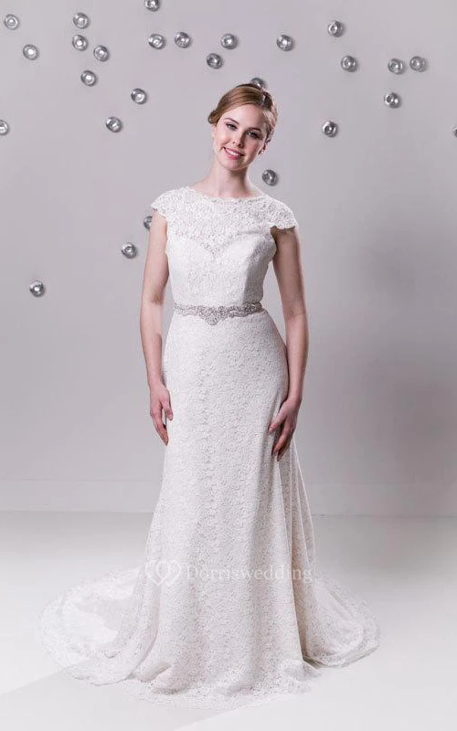 Lace Cap Sleeve High Neck Sheath Gown With Beaded Waistband